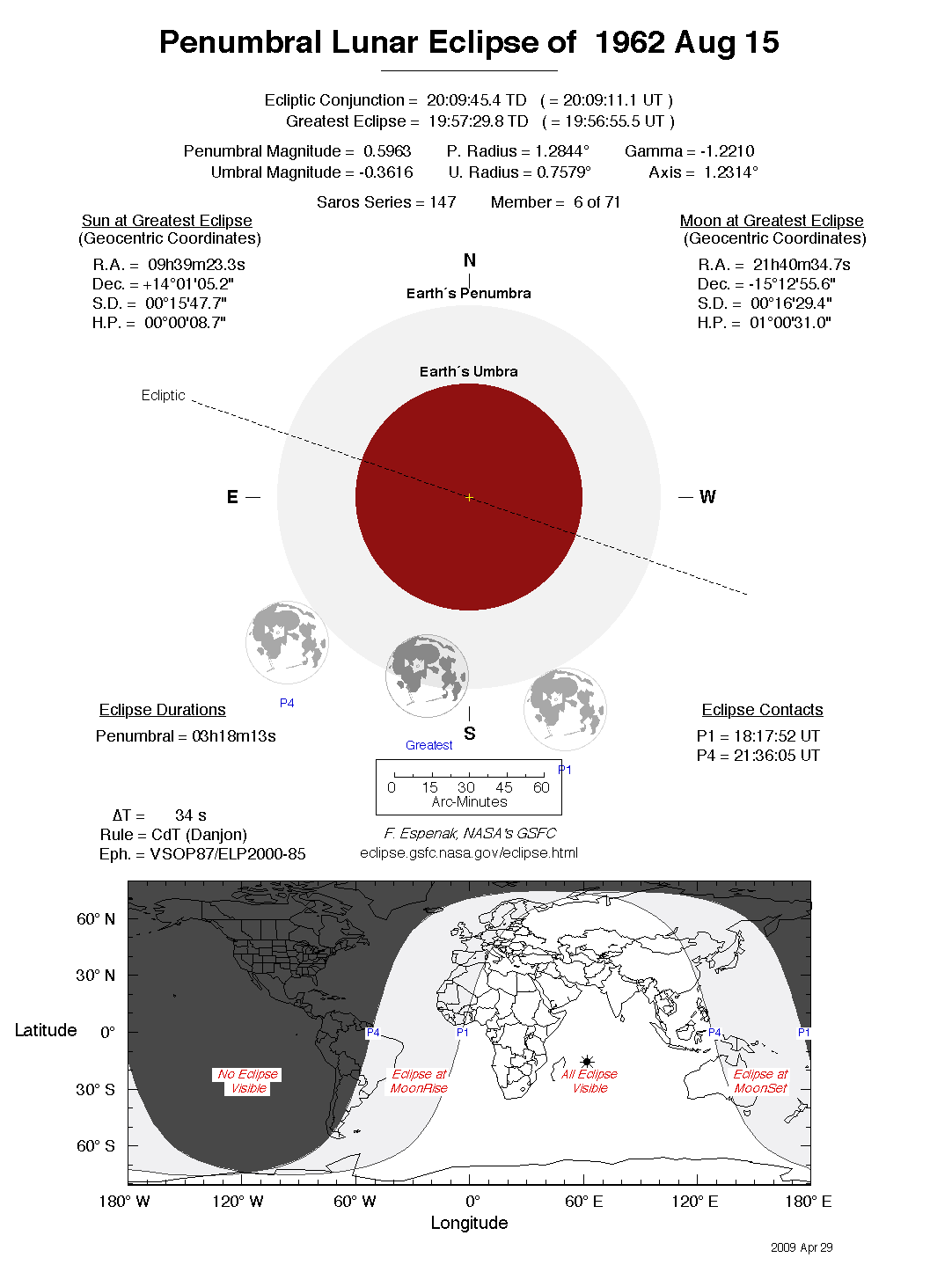 The tables below contain detailed predictions and additional information on the Penumbral Lunar Eclipse of 1962 Aug 15 .