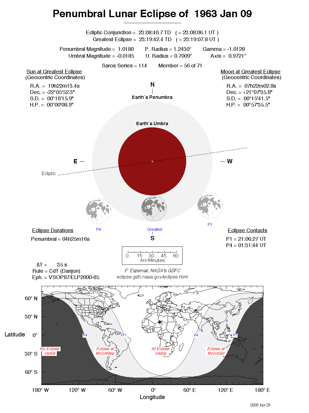 The tables below contain detailed predictions and additional information on the Penumbral Lunar Eclipse of 1963 Jan 09 .