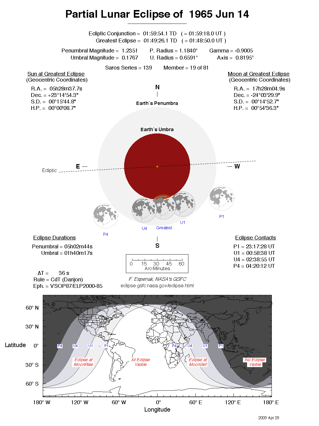 The tables below contain detailed predictions and additional information on the Partial Lunar Eclipse of 1965 Jun 14 .