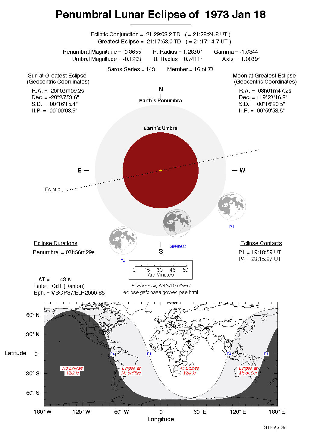 The tables below contain detailed predictions and additional information on the Penumbral Lunar Eclipse of 1973 Jan 18 .