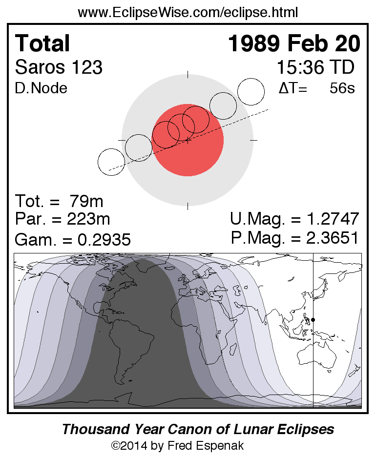 The instant of greatest eclipse takes place on 1989 Feb 20 at 15:36:18 TD (15:35:22 UT1). This is 3.0 days before the Moon reaches apogee. During the eclipse, the Moon is in the constellation Leo. The synodic month in which the eclipse takes place has a Brown Lunation Number of 818.
