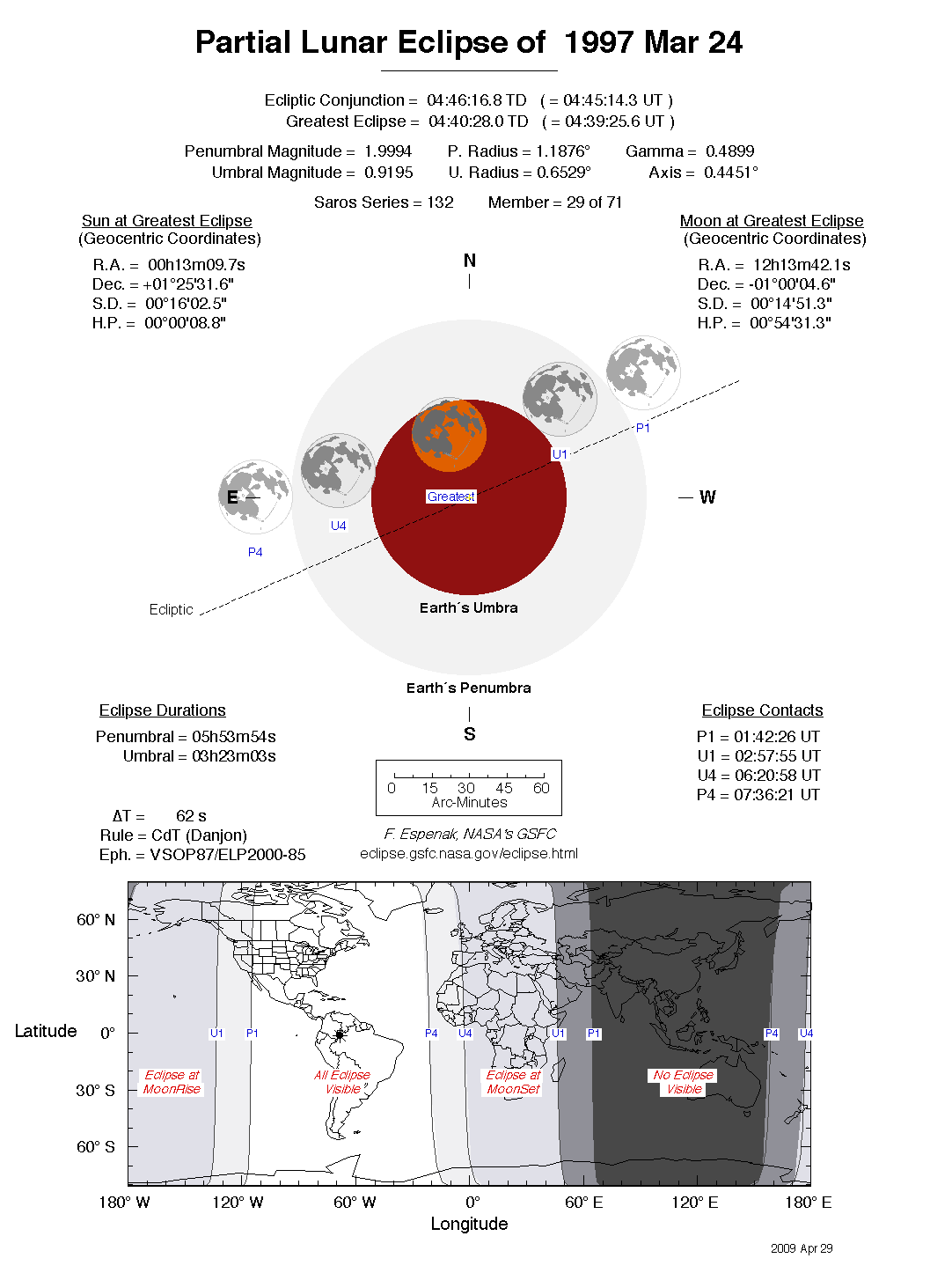 The instant of greatest eclipse takes place on 1997 Mar 24 at 04:40:28 TD (04:39:26 UT1). This is 3.2 days after the Moon reaches apogee. During the eclipse, the Moon is in the constellation Virgo. The synodic month in which the eclipse takes place has a Brown Lunation Number of 918.