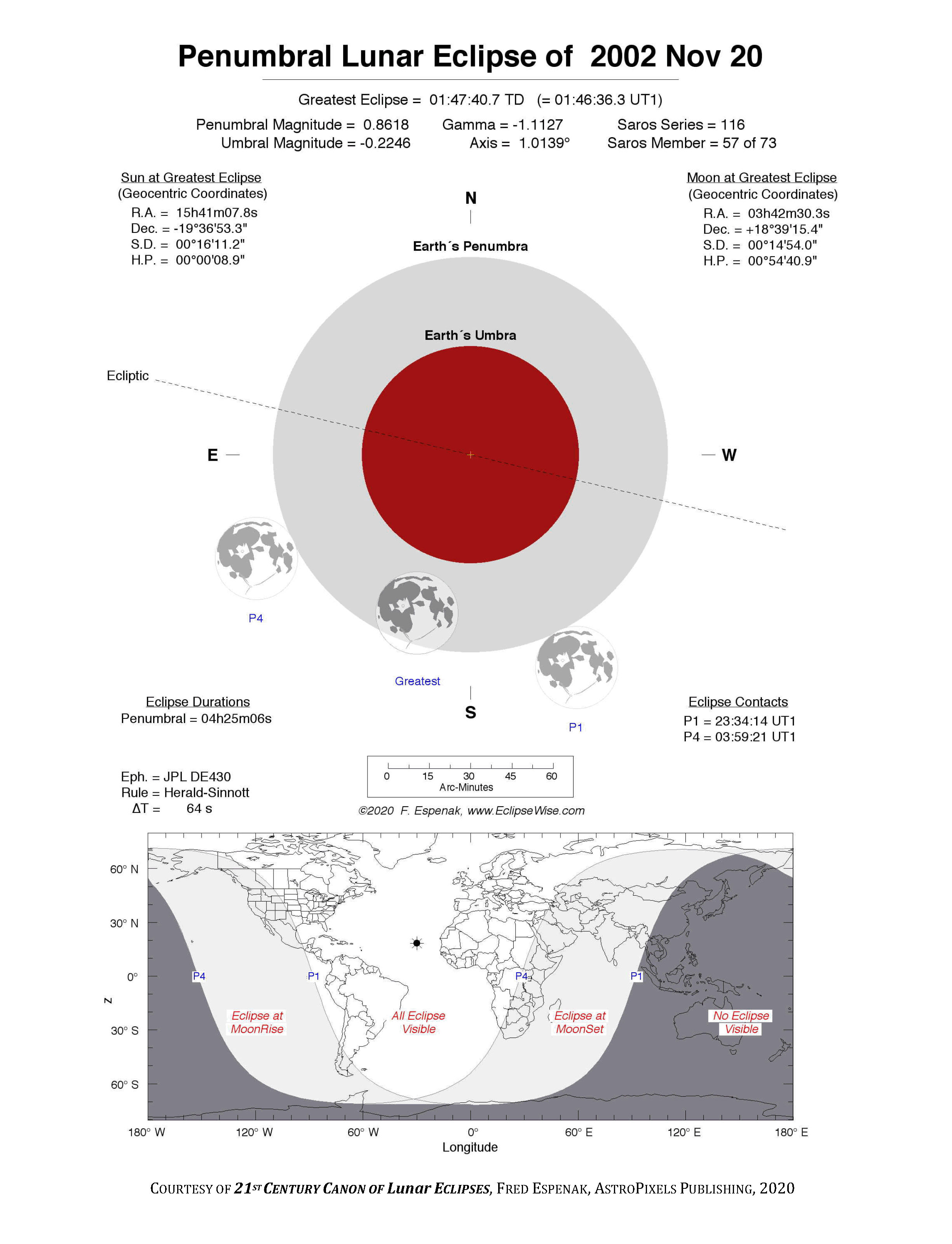 The penumbral lunar eclipse of 2002 Nov 20 is followed two weeks later by a total solar eclipse on 2002 Dec 04.