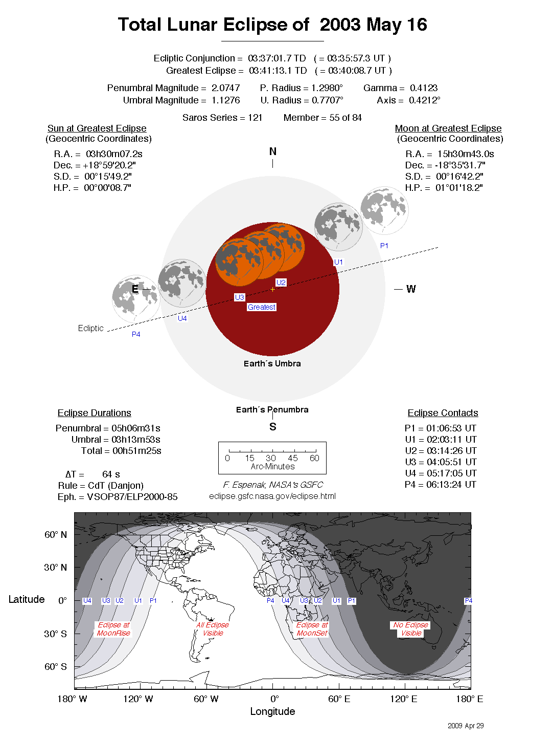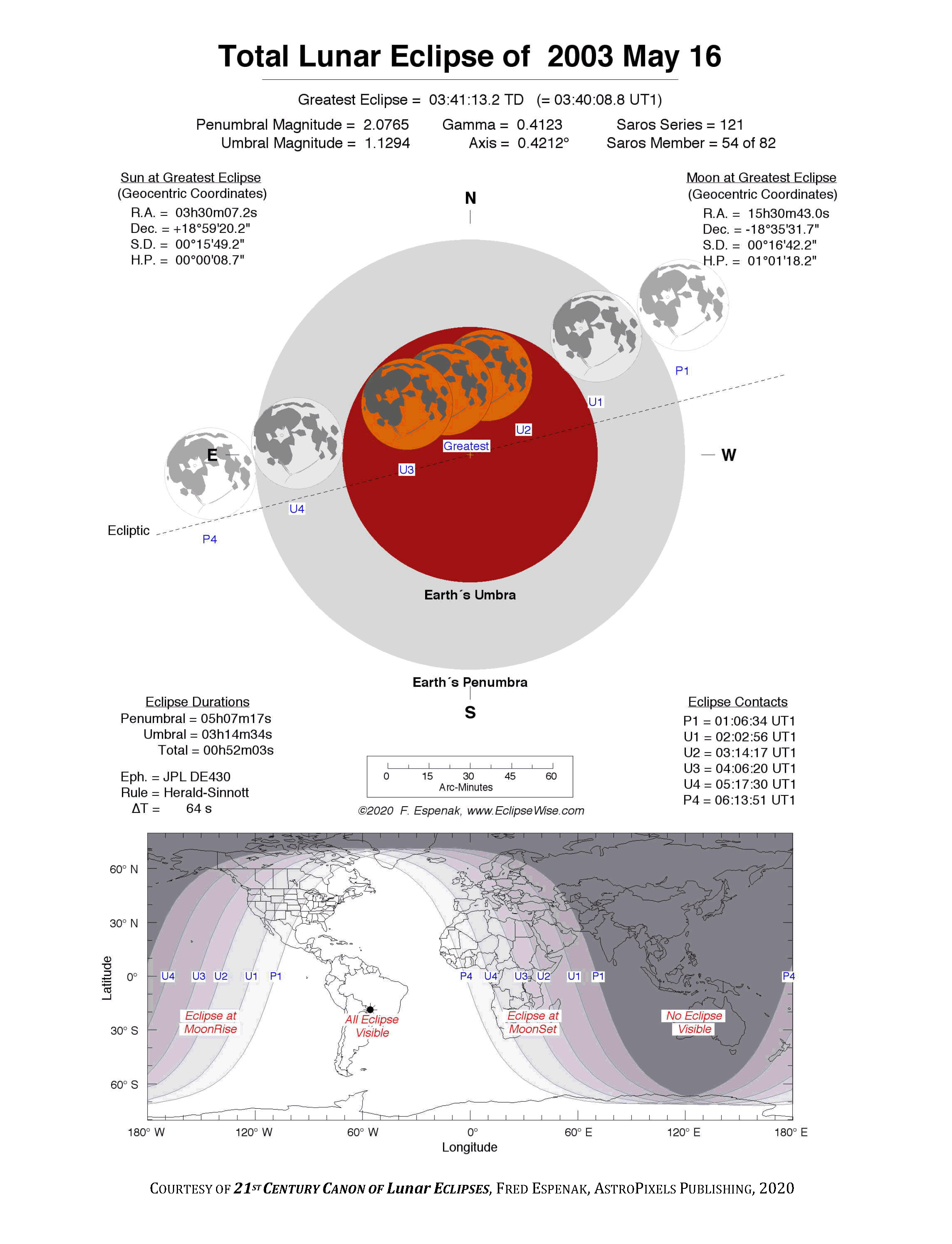 The instant of greatest eclipse takes place on 2003 May 16 at 03:41:13 TD (03:40:09 UT1). This is 0.5 days after the Moon reaches perigee. During the eclipse, the Moon is in the constellation Libra. The synodic month in which the eclipse takes place has a Brown Lunation Number of 994.