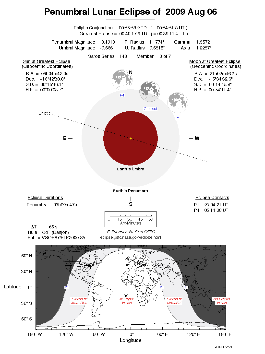 - Detailed Lunar Eclipse Figure - eclipse geometry diagram and map of eclipse visibility (Key to Figure)
