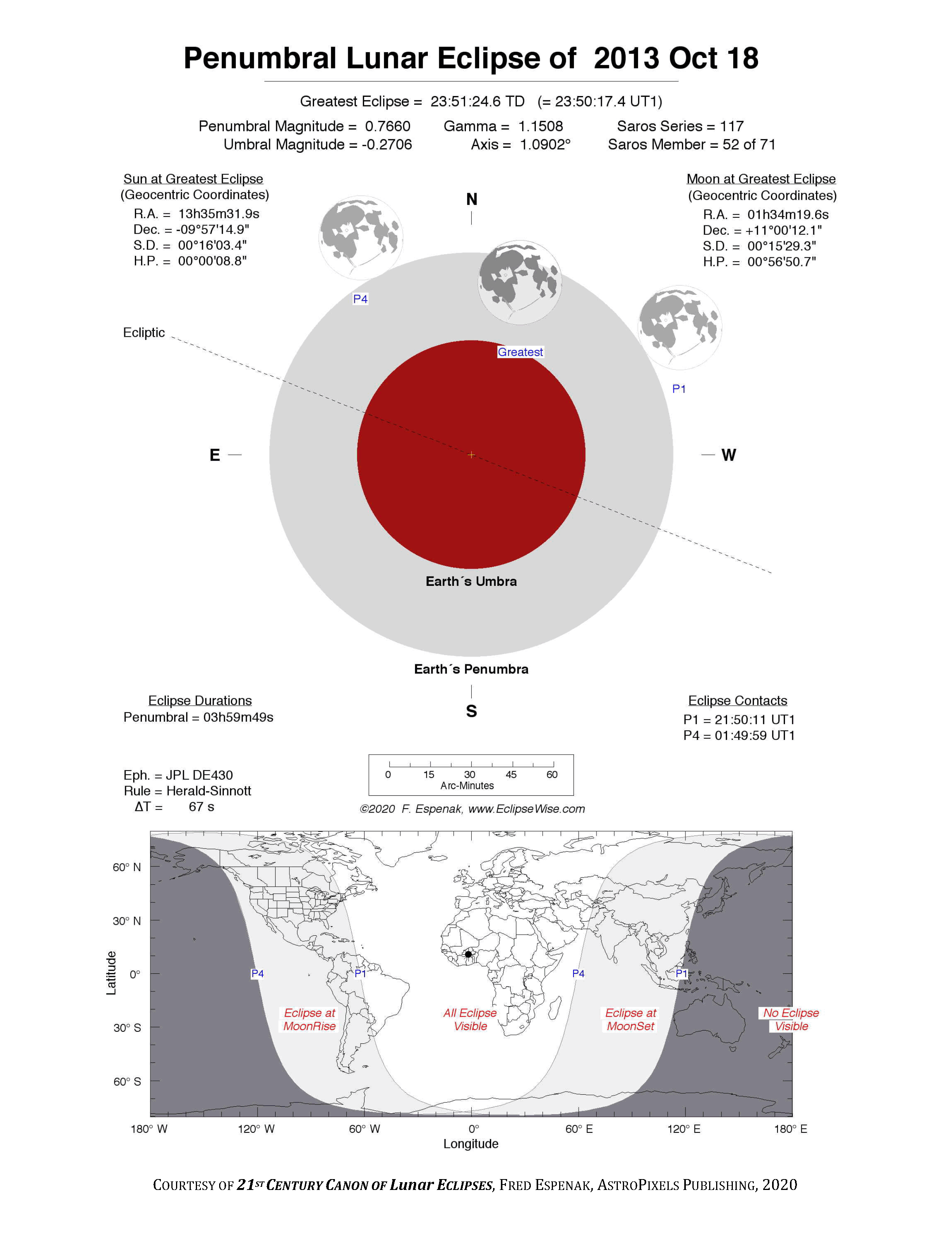 The instant of greatest eclipse takes place on 2013 Oct 18 at 23:51:25 TD (23:50:17 UT1). This is 6.6 days before the Moon reaches apogee. During the eclipse, the Moon is in the constellation Aries. The synodic month in which the eclipse takes place has a Brown Lunation Number of 1123.