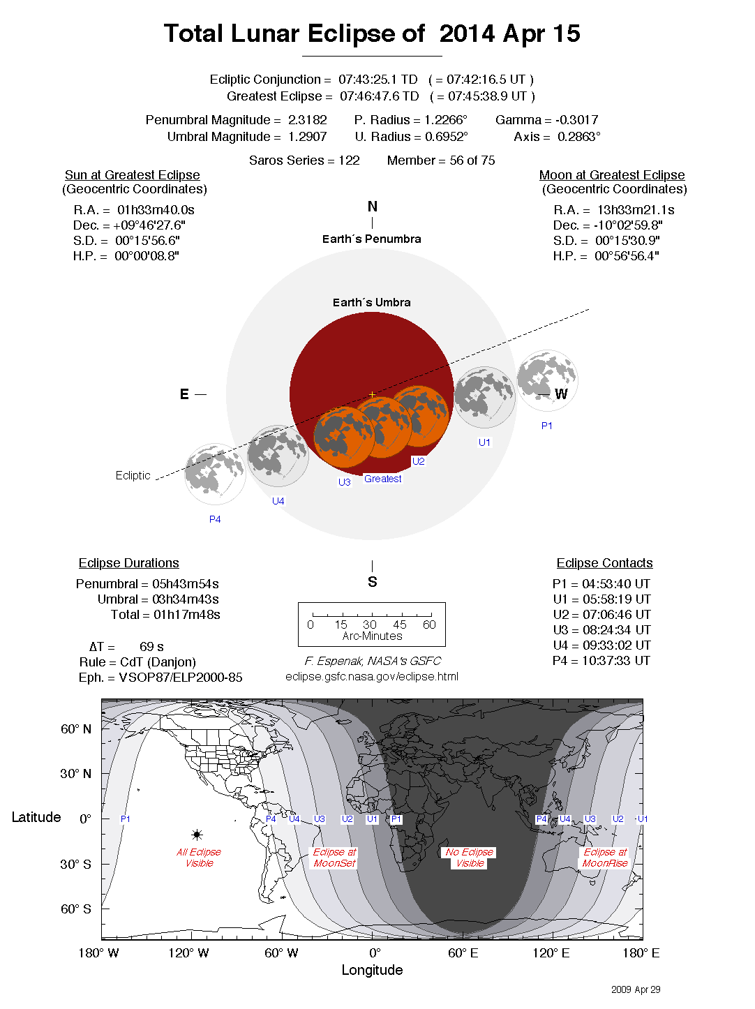 The instant of greatest eclipse takes place on 2014 Apr 15 at 07:46:48 TD (07:45:40 UT1). This is 6.7 days after the Moon reaches apogee. During the eclipse, the Moon is in the constellation Virgo. The synodic month in which the eclipse takes place has a Brown Lunation Number of 1129.