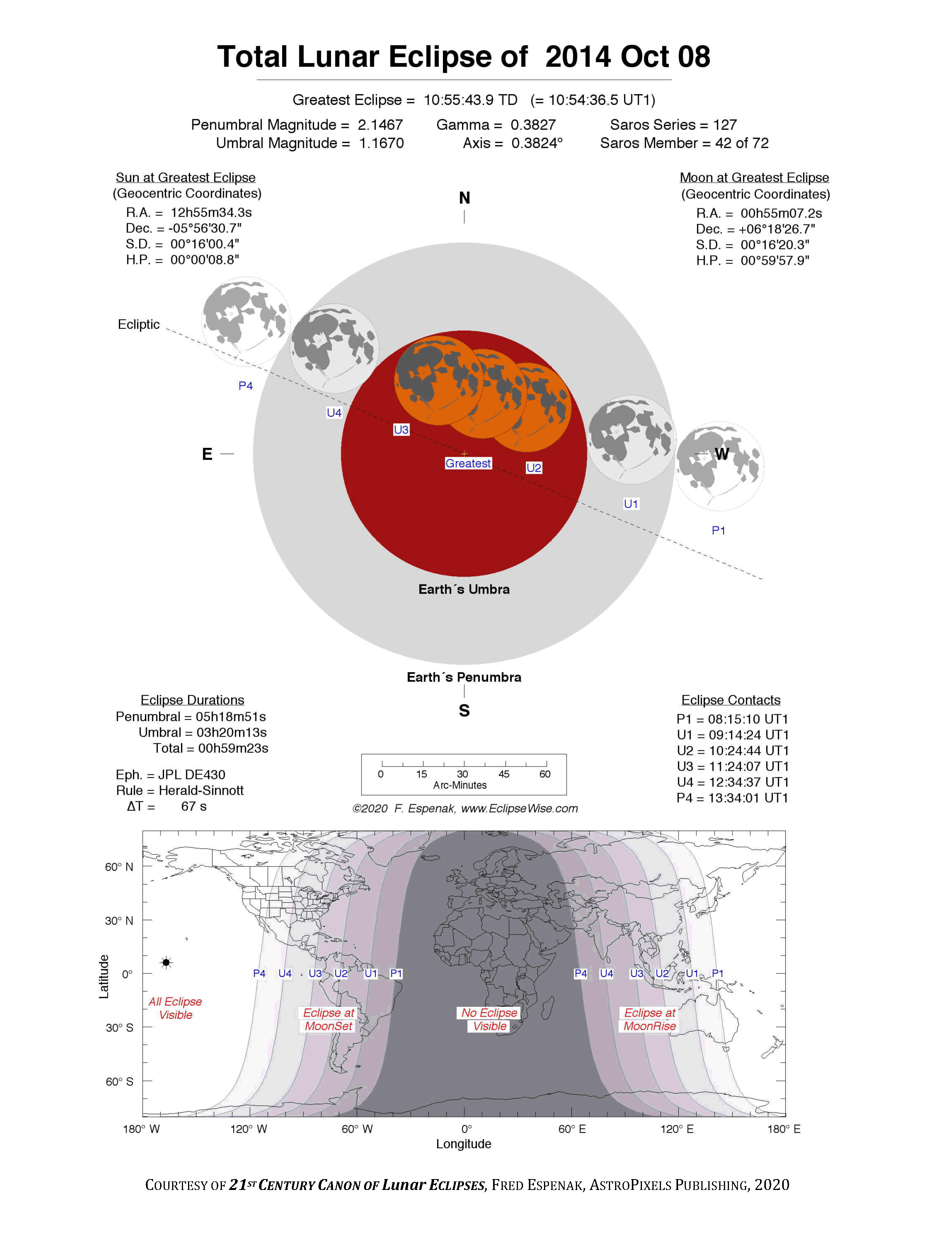 - Detailed Lunar Eclipse Figure - eclipse geometry diagram and map of eclipse visibility (Key to Figure)