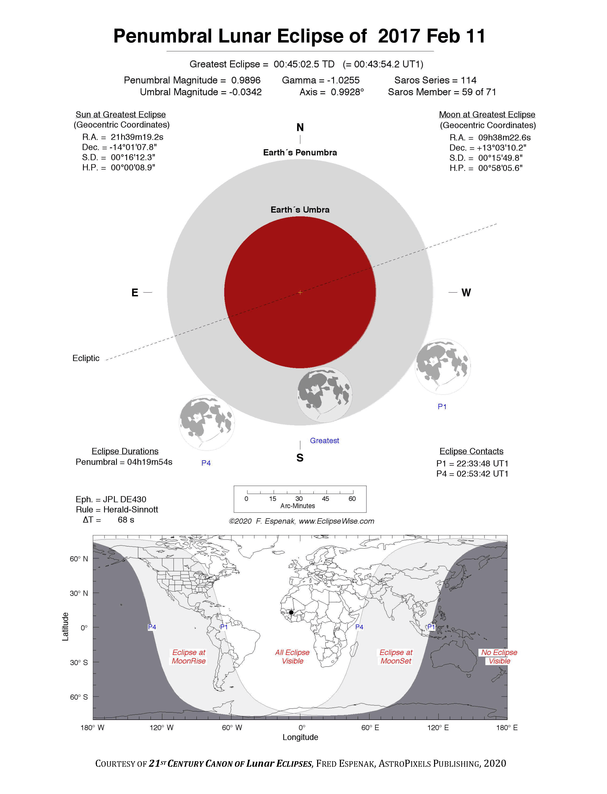 The instant of greatest eclipse takes place on 2017 Feb 11 at 00:45:03 TD (00:43:54 UT1). This is 4.4 days after the Moon reaches perigee. During the eclipse, the Moon is in the constellation Leo. The synodic month in which the eclipse takes place has a Brown Lunation Number of 1164.