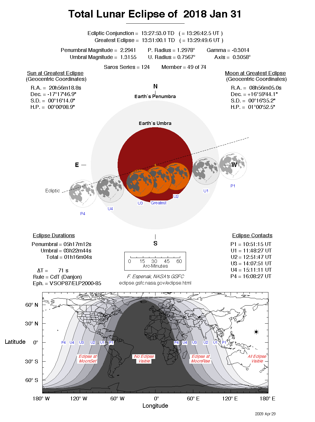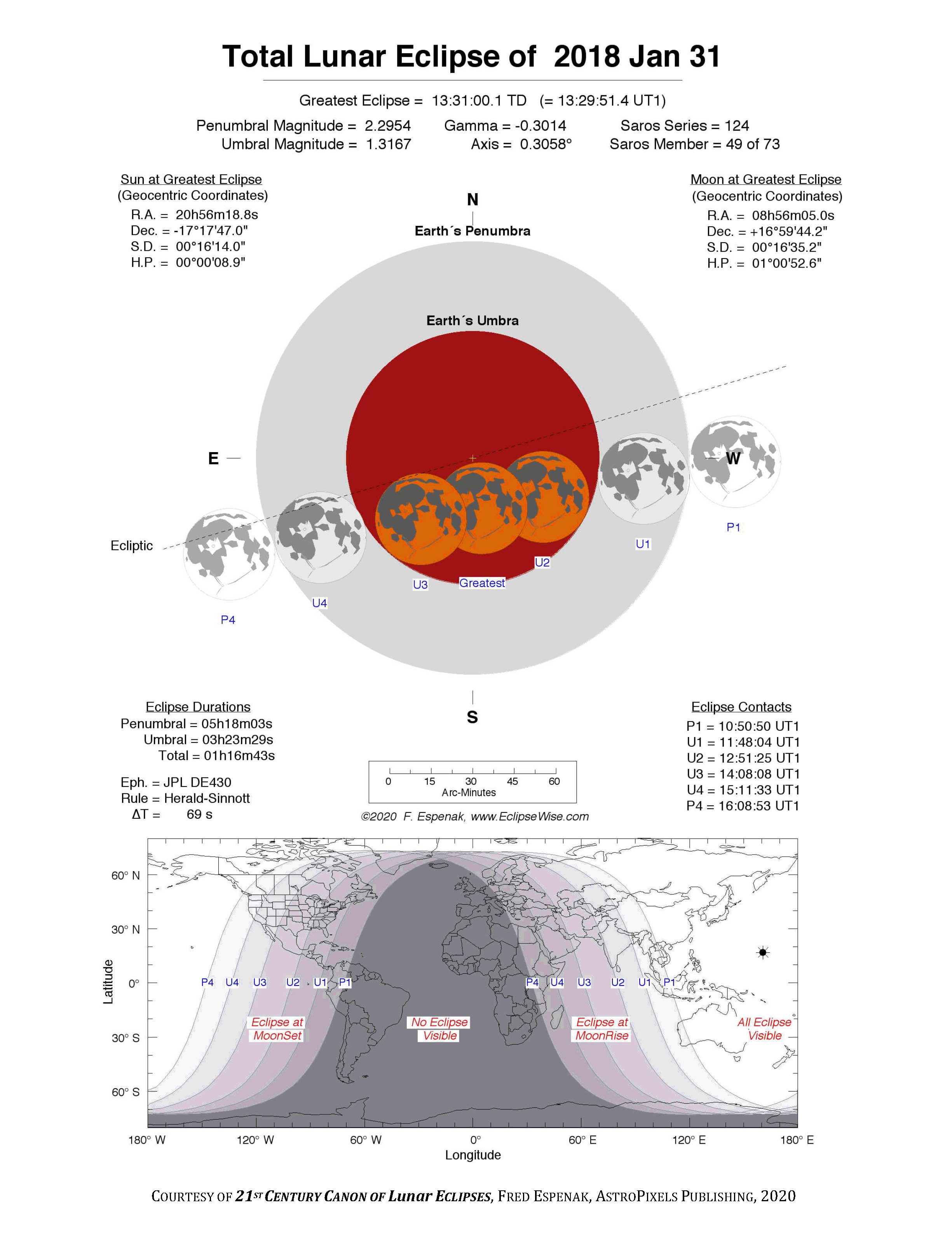 The instant of greatest eclipse takes place on 2018 Jan 31 at 13:31:00 TD (13:29:51 UT1). This is 1.2 days after the Moon reaches perigee. During the eclipse, the Moon is in the constellation Cancer. The synodic month in which the eclipse takes place has a Brown Lunation Number of 1176.