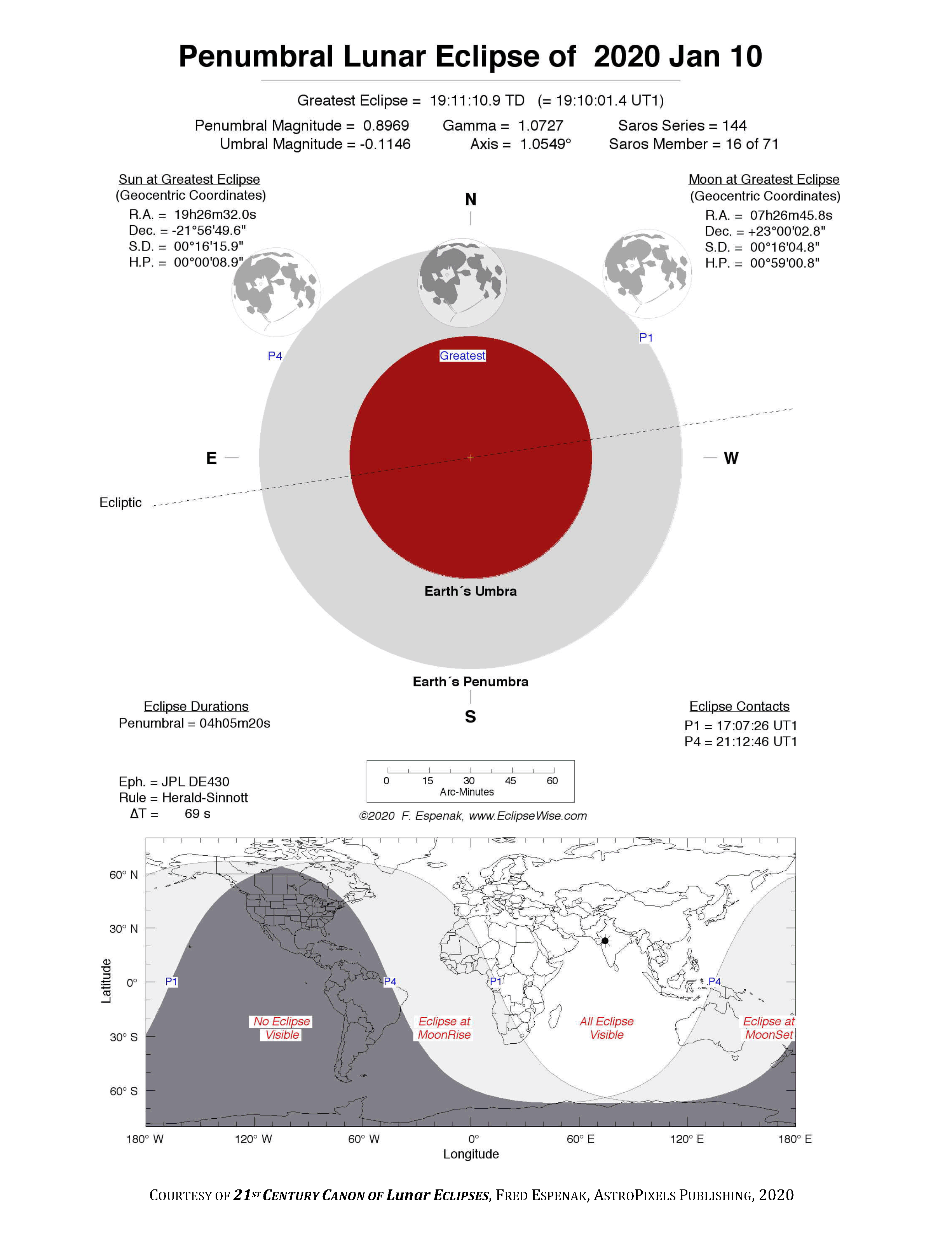 The instant of greatest eclipse takes place on 2020 Jan 10 at 19:11:11 TD (19:10:01 UT1). This is 3.0 days before the Moon reaches perigee. During the eclipse, the Moon is in the constellation Gemini. The synodic month in which the eclipse takes place has a Brown Lunation Number of 1200.