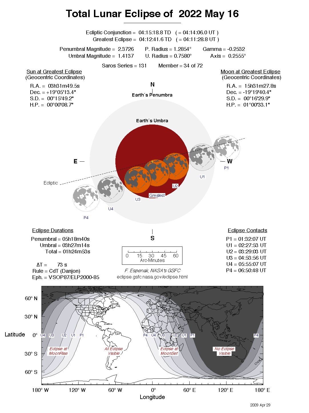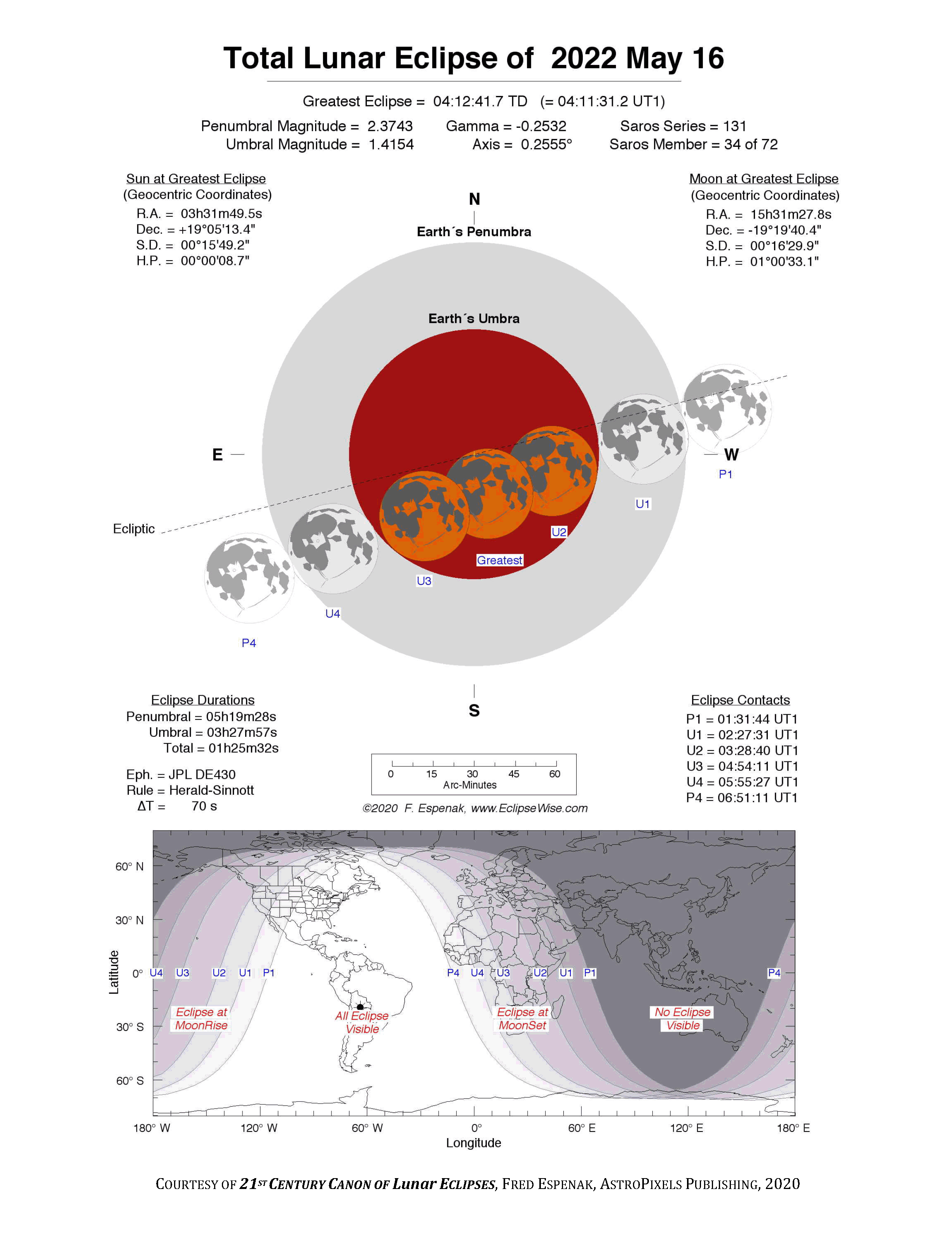 - Detailed Lunar Eclipse Figure - eclipse geometry diagram and map of eclipse visibility (Key to Figure)