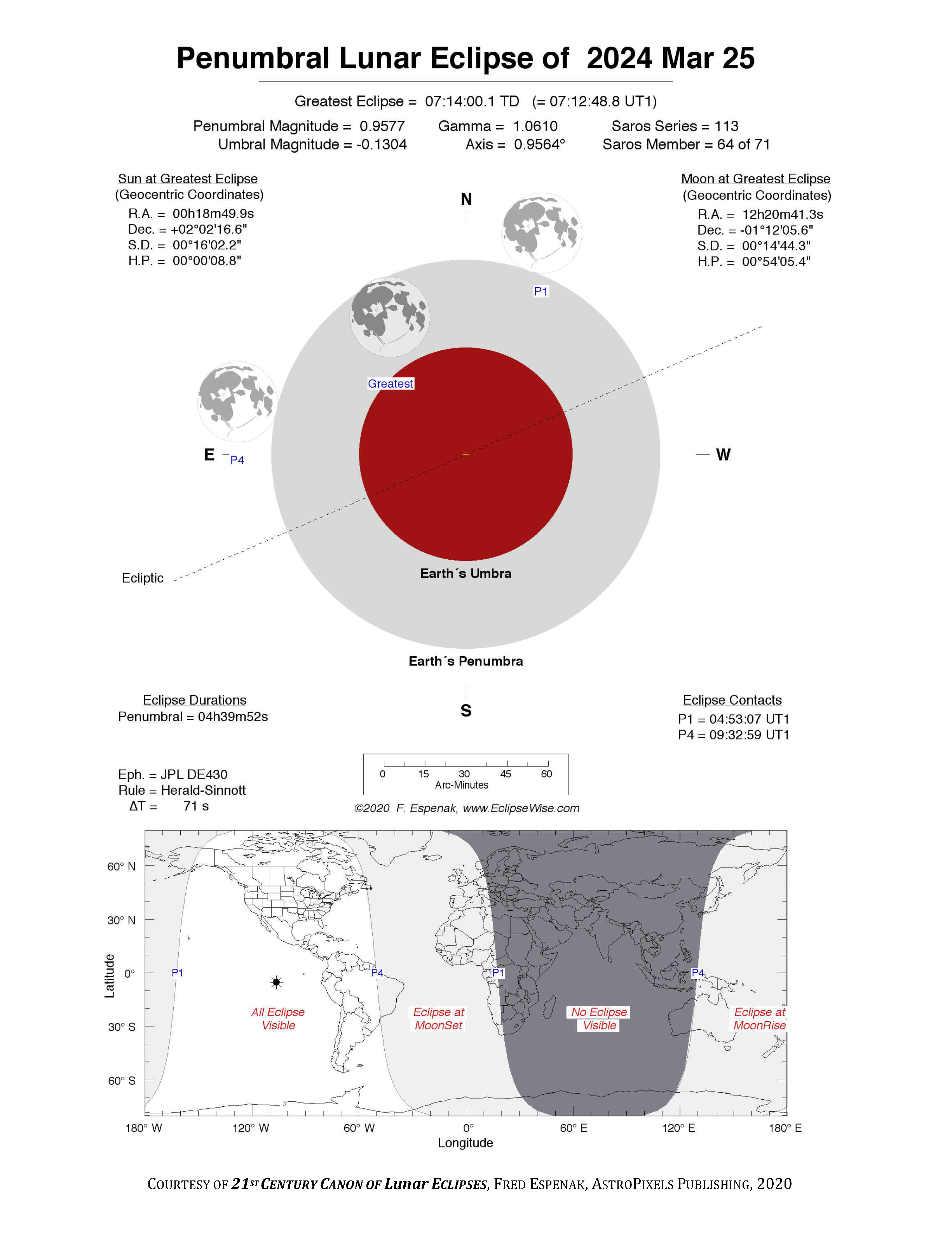 The tables below contain detailed predictions and additional information on the Penumbral Lunar Eclipse of 2024 Mar 25 .