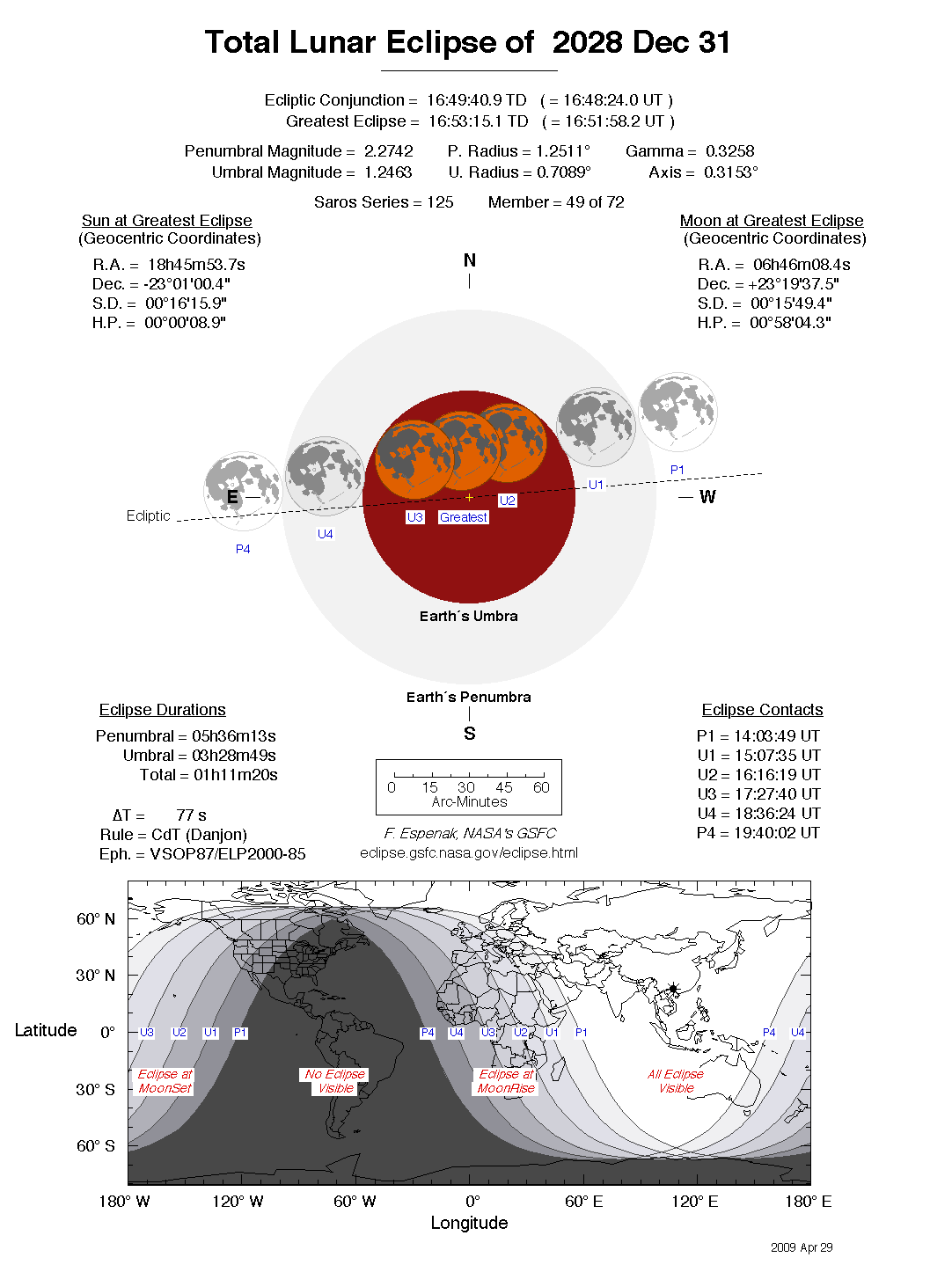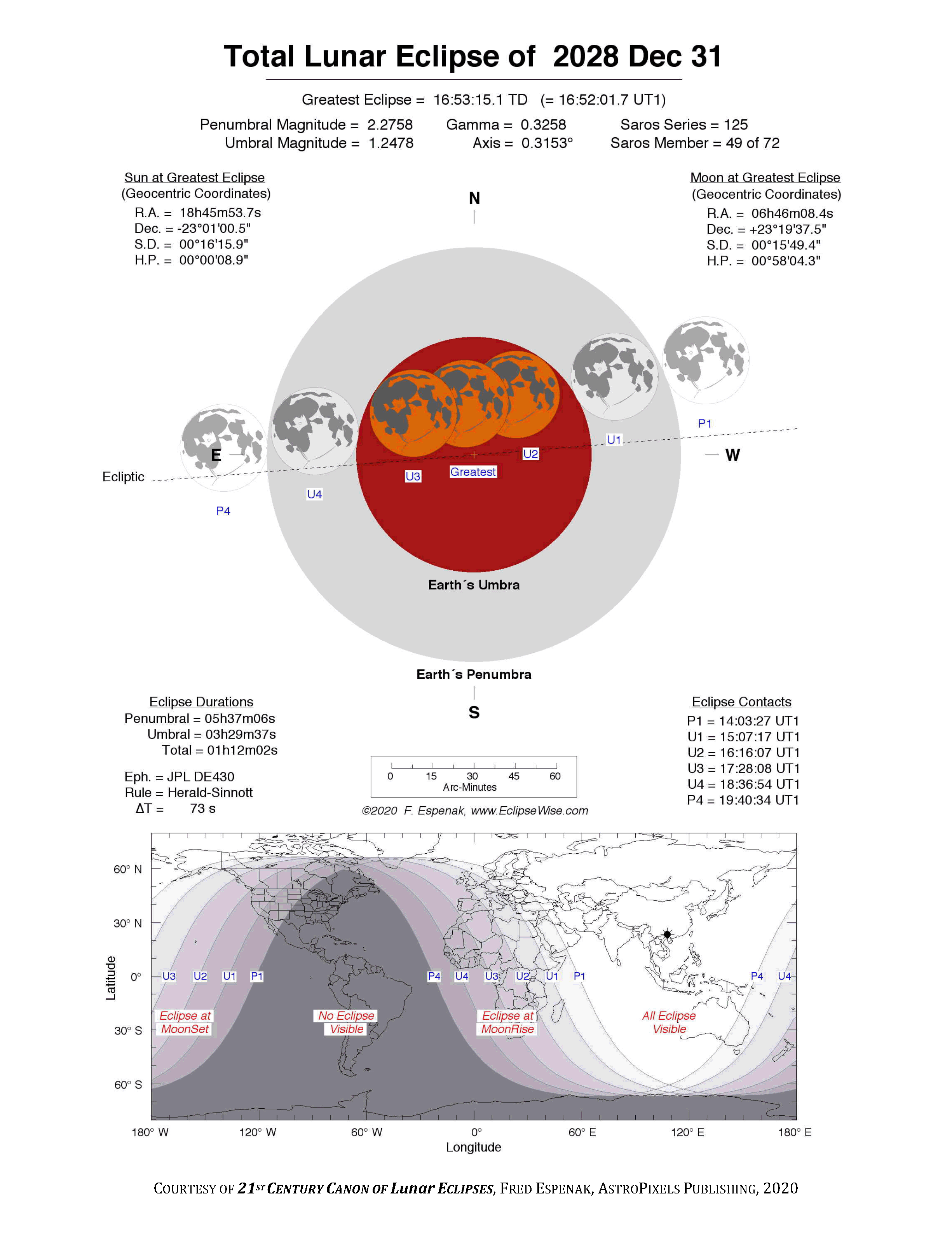 The tables below contain detailed predictions and additional information on the Total Lunar Eclipse of 2028 Dec 31 .