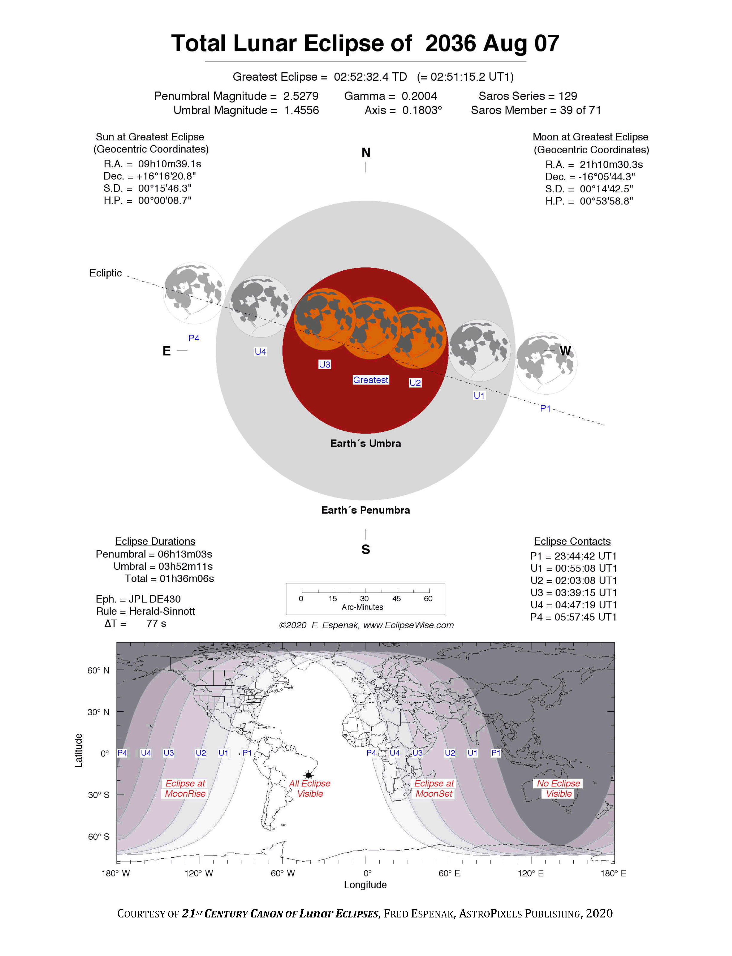 The instant of greatest eclipse takes place on 2036 Aug 07 at 02:52:32 TD (02:51:15 UT1). This is 0.3 days after the Moon reaches apogee. During the eclipse, the Moon is in the constellation Capricornus. The synodic month in which the eclipse takes place has a Brown Lunation Number of 1405.