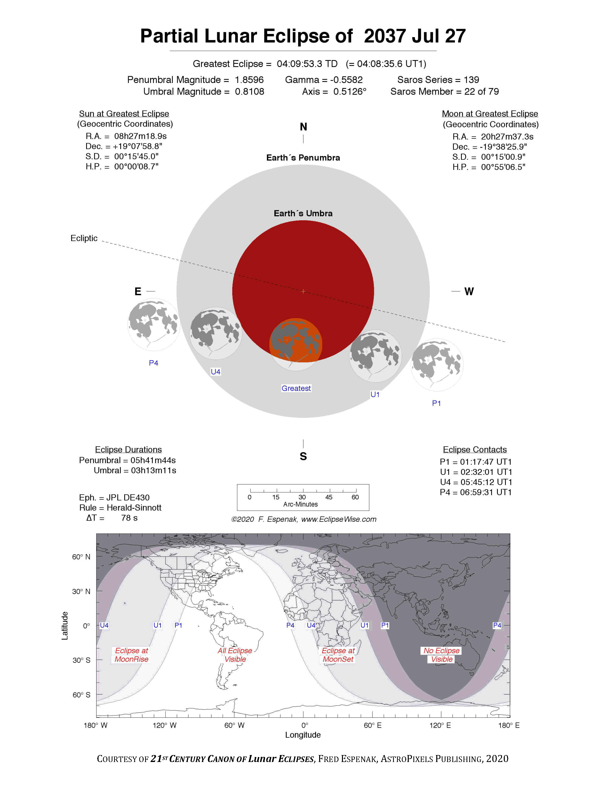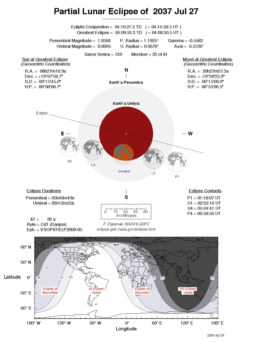 The tables below contain detailed predictions and additional information on the Partial Lunar Eclipse of 2037 Jul 27 .