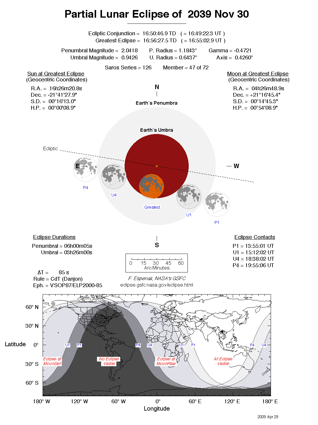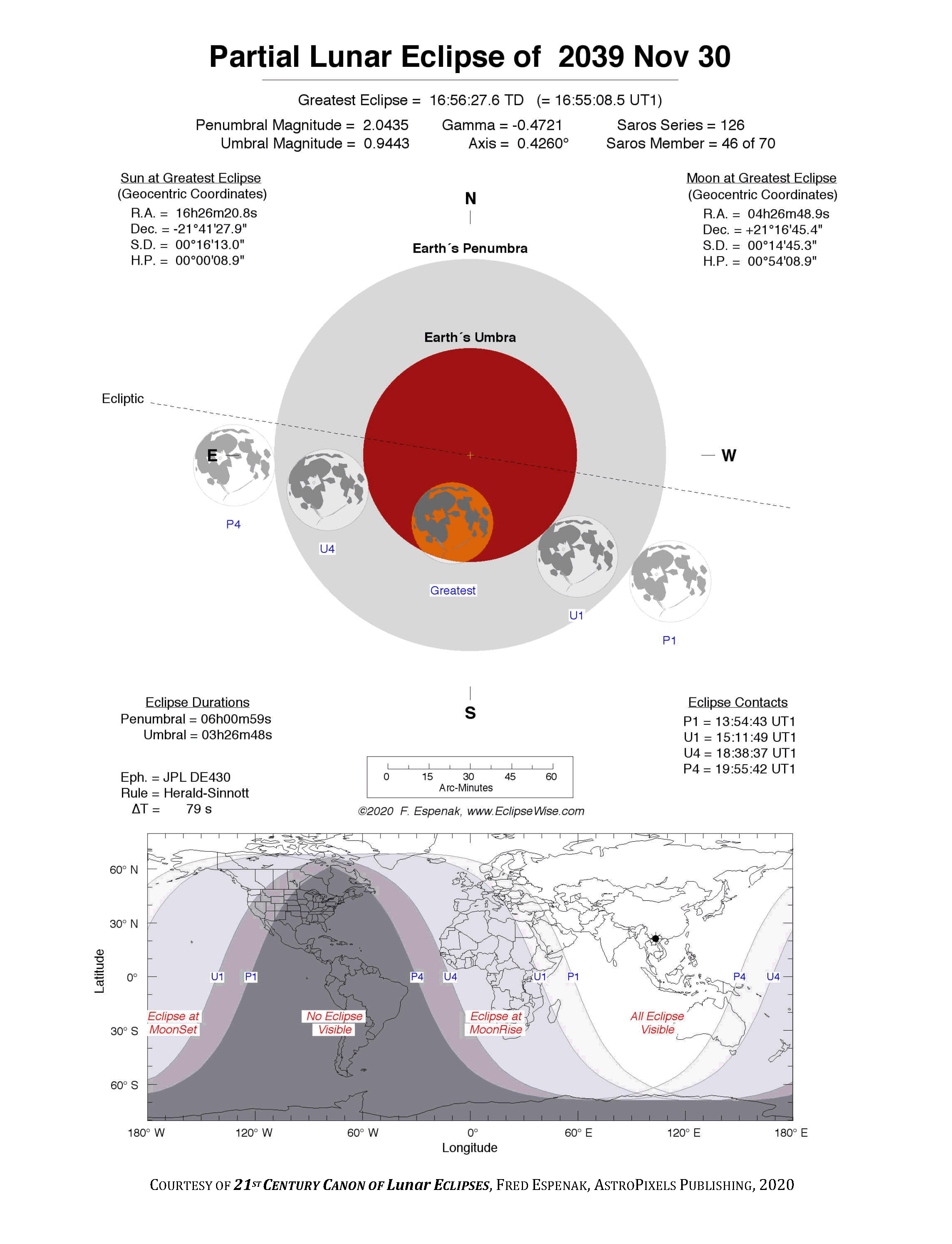 The tables below contain detailed predictions and additional information on the Partial Lunar Eclipse of 2039 Nov 30 .