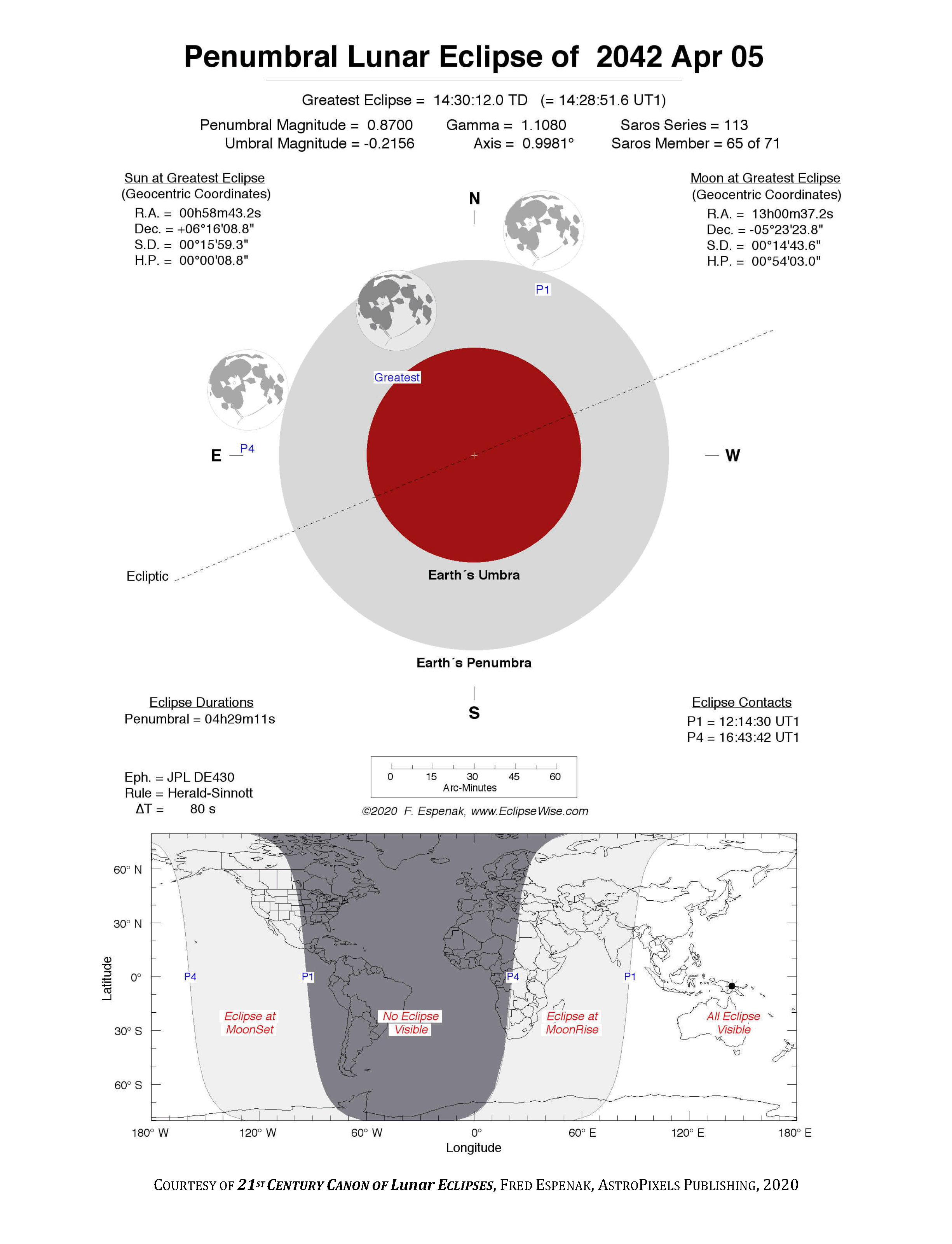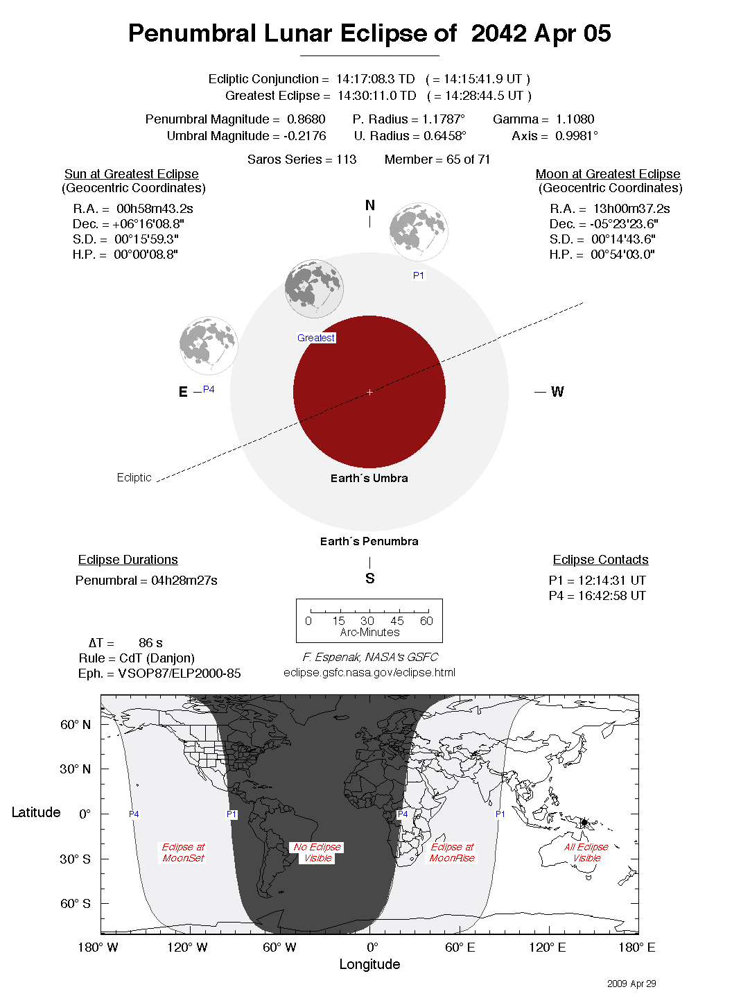 The tables below contain detailed predictions and additional information on the Penumbral Lunar Eclipse of 2042 Apr 05 .