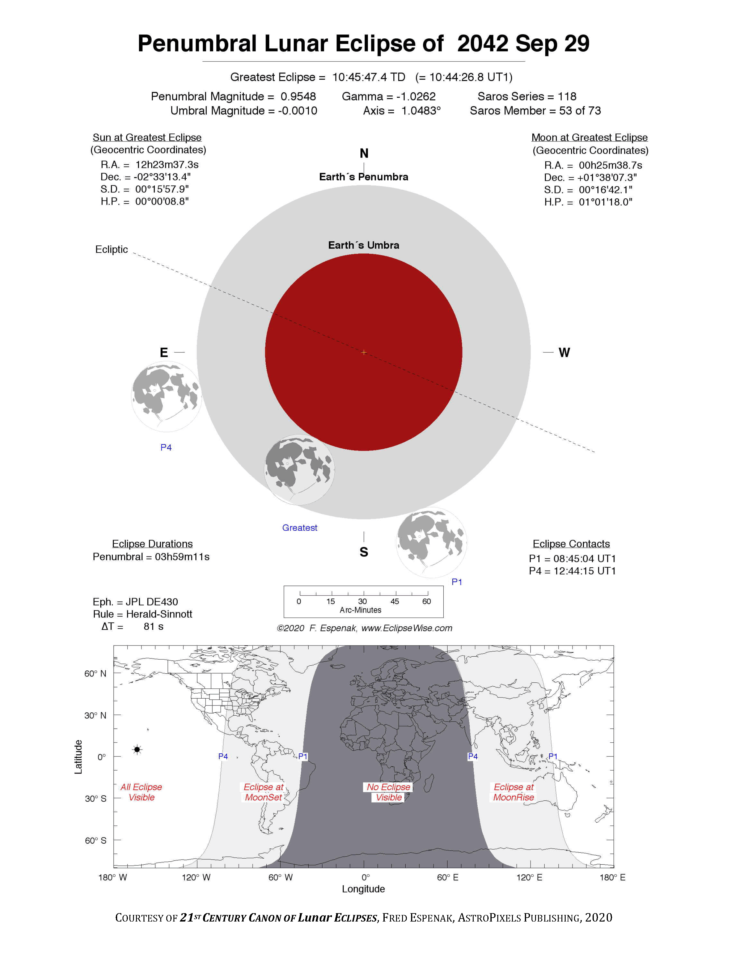 The tables below contain detailed predictions and additional information on the Penumbral Lunar Eclipse of 2042 Sep 29 .
