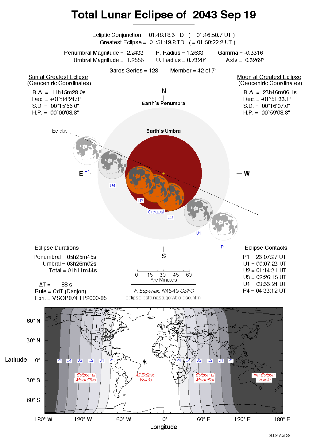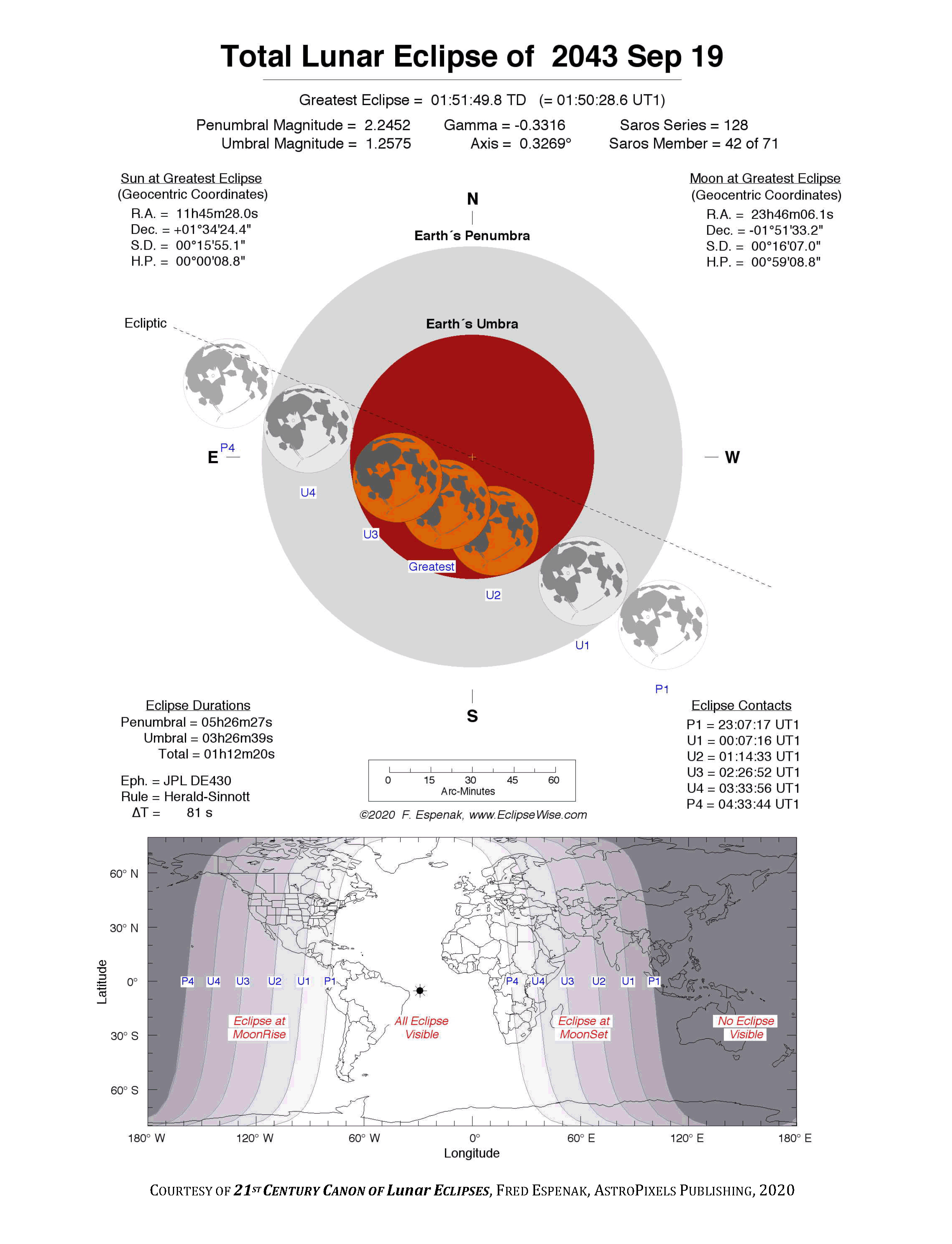 The tables below contain detailed predictions and additional information on the Total Lunar Eclipse of 2043 Sep 19 .