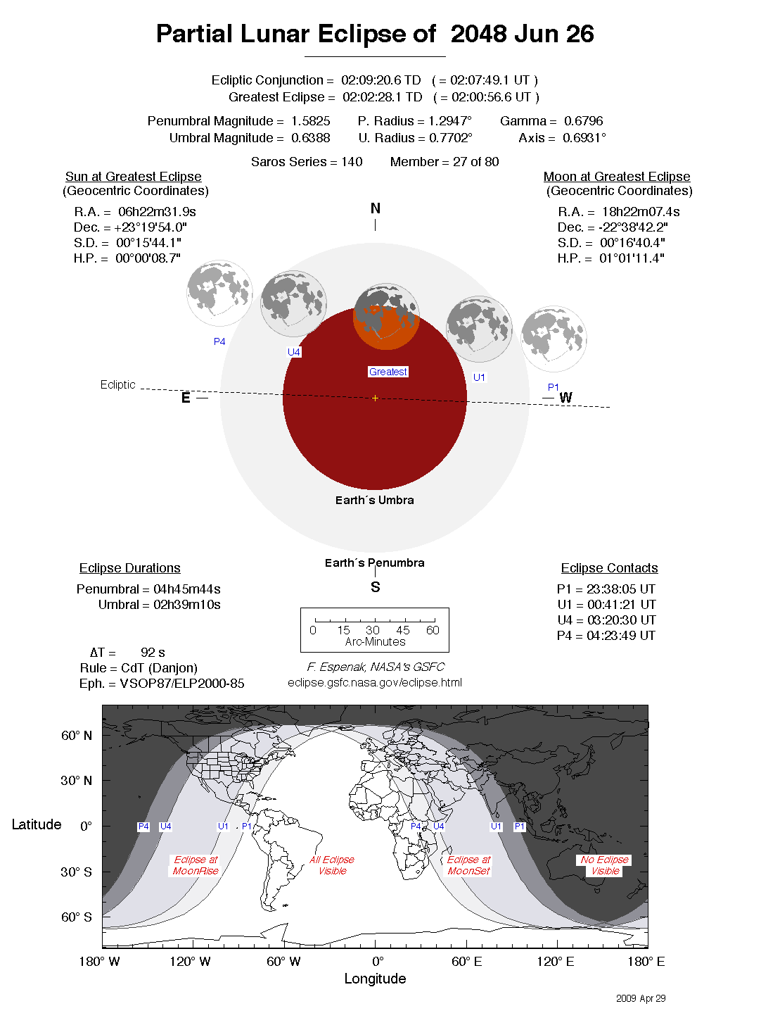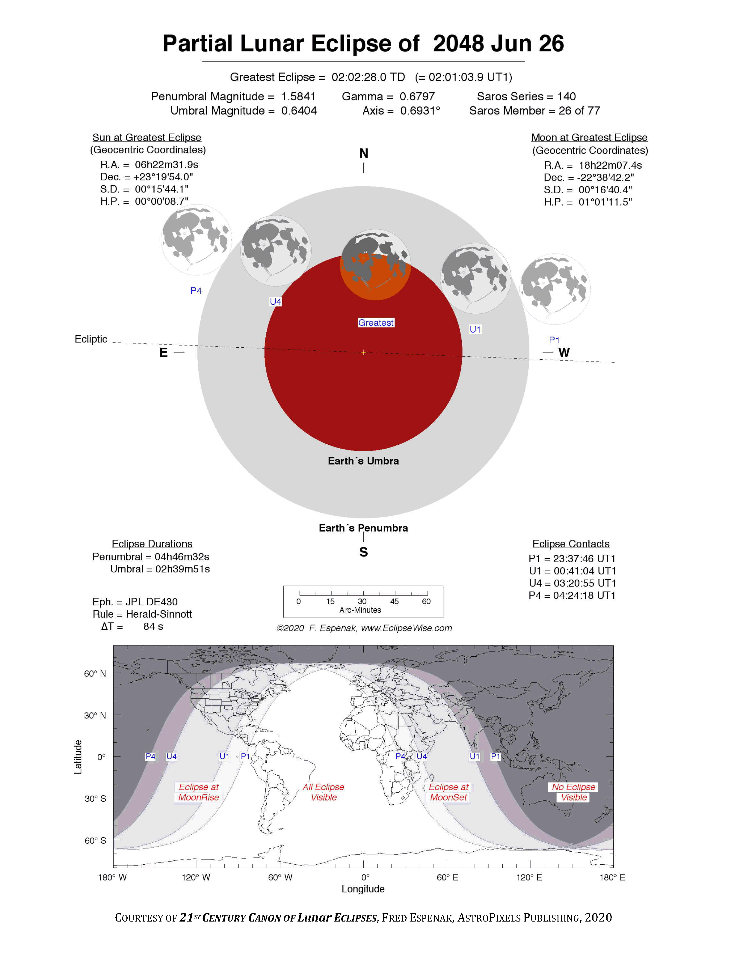The tables below contain detailed predictions and additional information on the Partial Lunar Eclipse of 2048 Jun 26 .