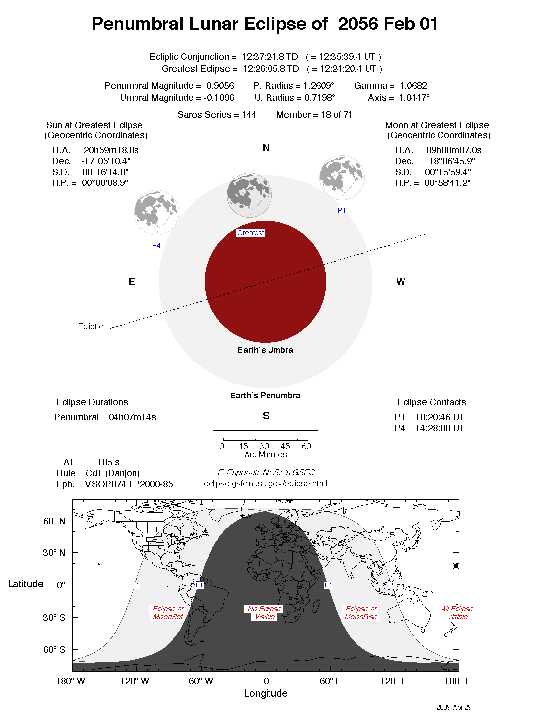 The tables below contain detailed predictions and additional information on the Penumbral Lunar Eclipse of 2056 Feb 01 .