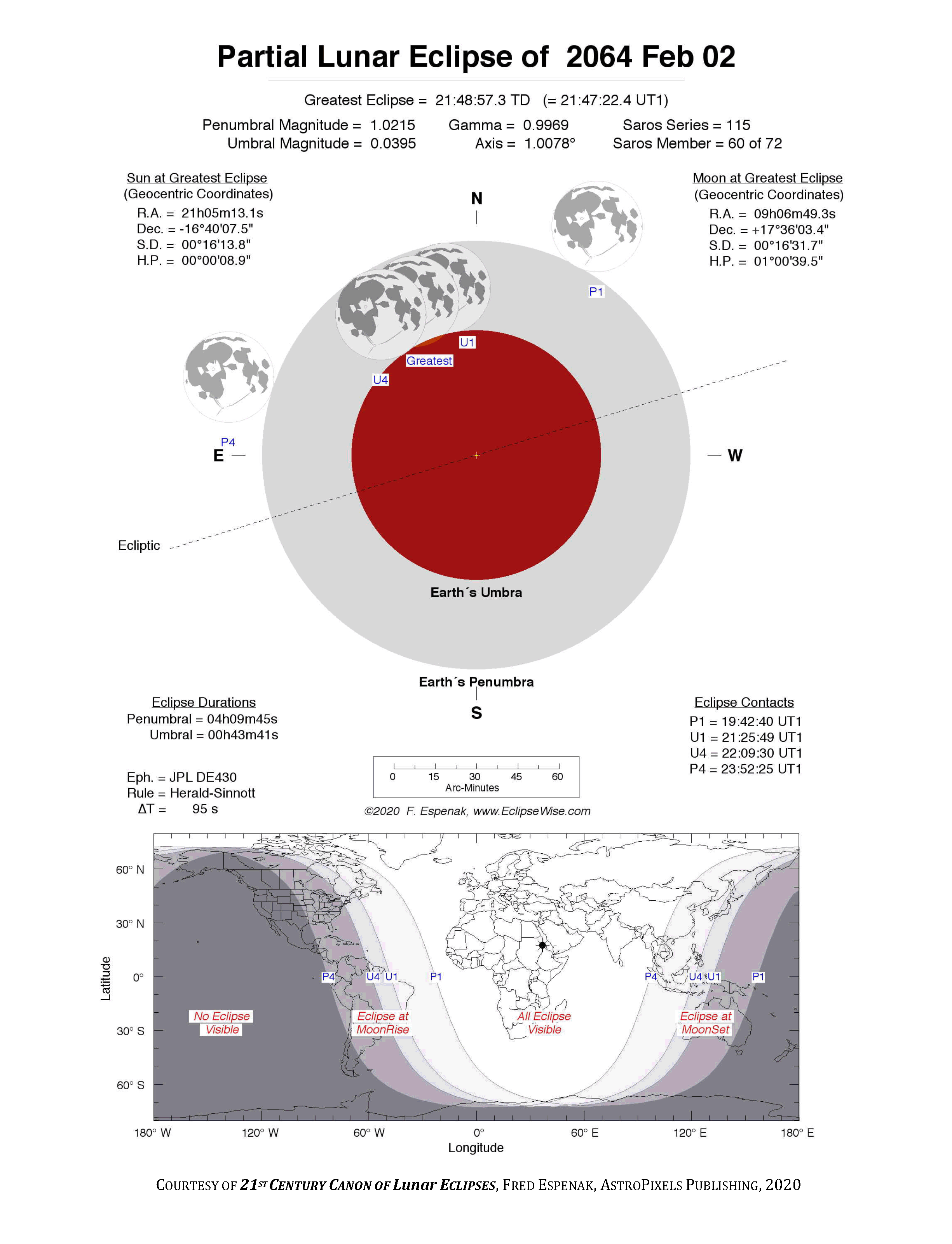 The tables below contain detailed predictions and additional information on the Partial Lunar Eclipse of 2064 Feb 02 .