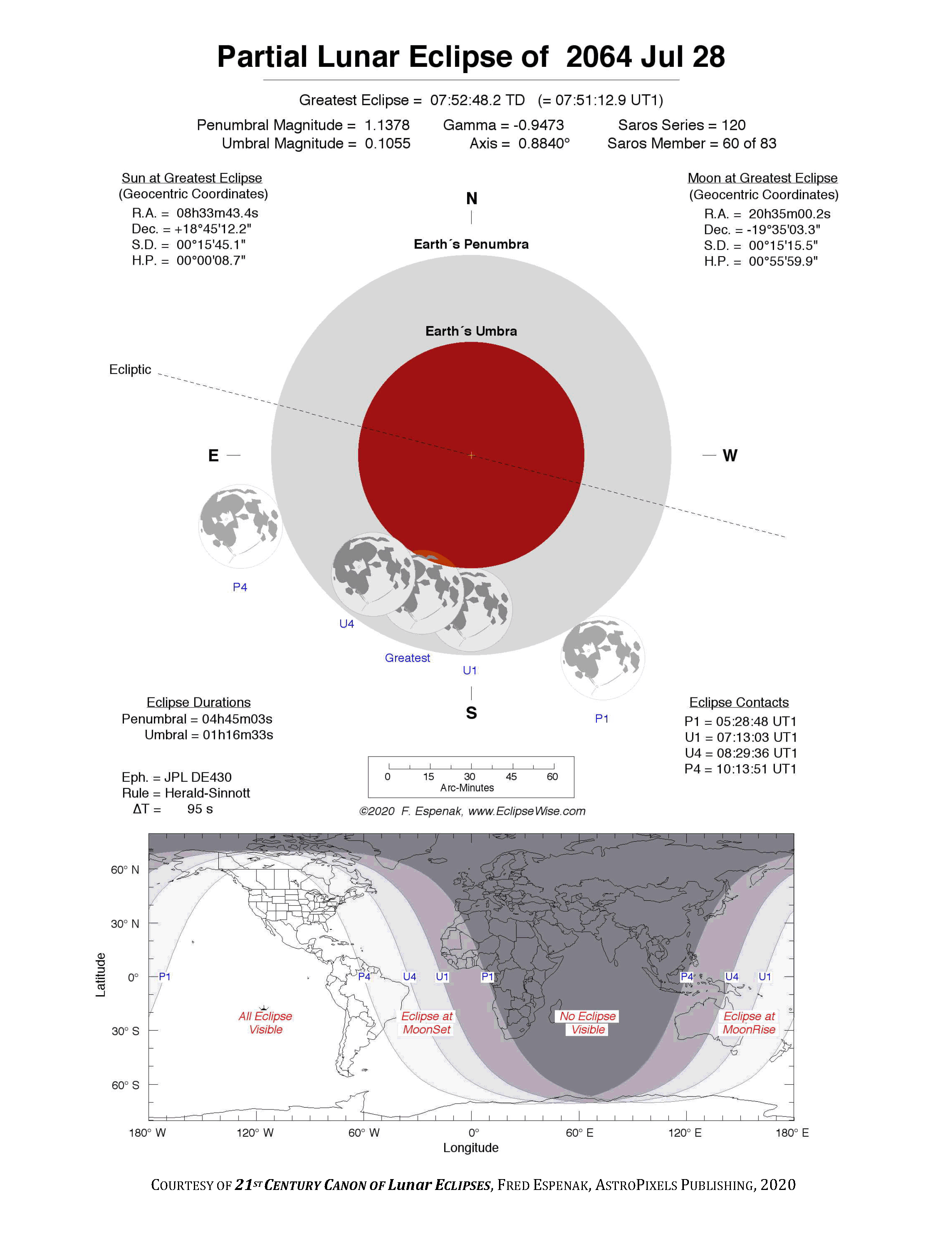 The tables below contain detailed predictions and additional information on the Partial Lunar Eclipse of 2064 Jul 28 .