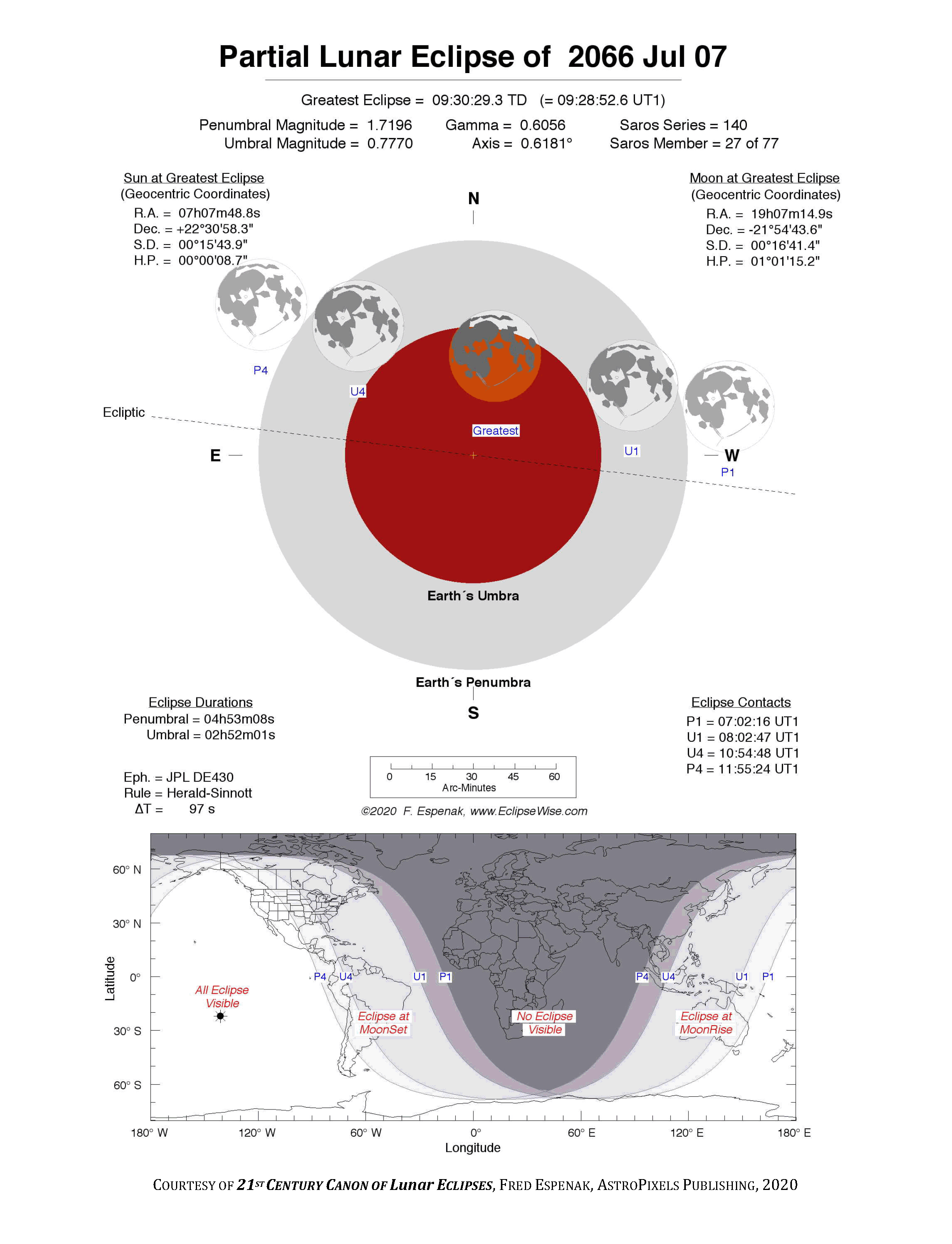 The tables below contain detailed predictions and additional information on the Partial Lunar Eclipse of 2066 Jul 07 .