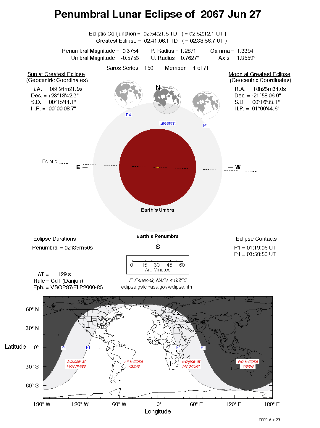 The tables below contain detailed predictions and additional information on the Penumbral Lunar Eclipse of 2067 Jun 27 .