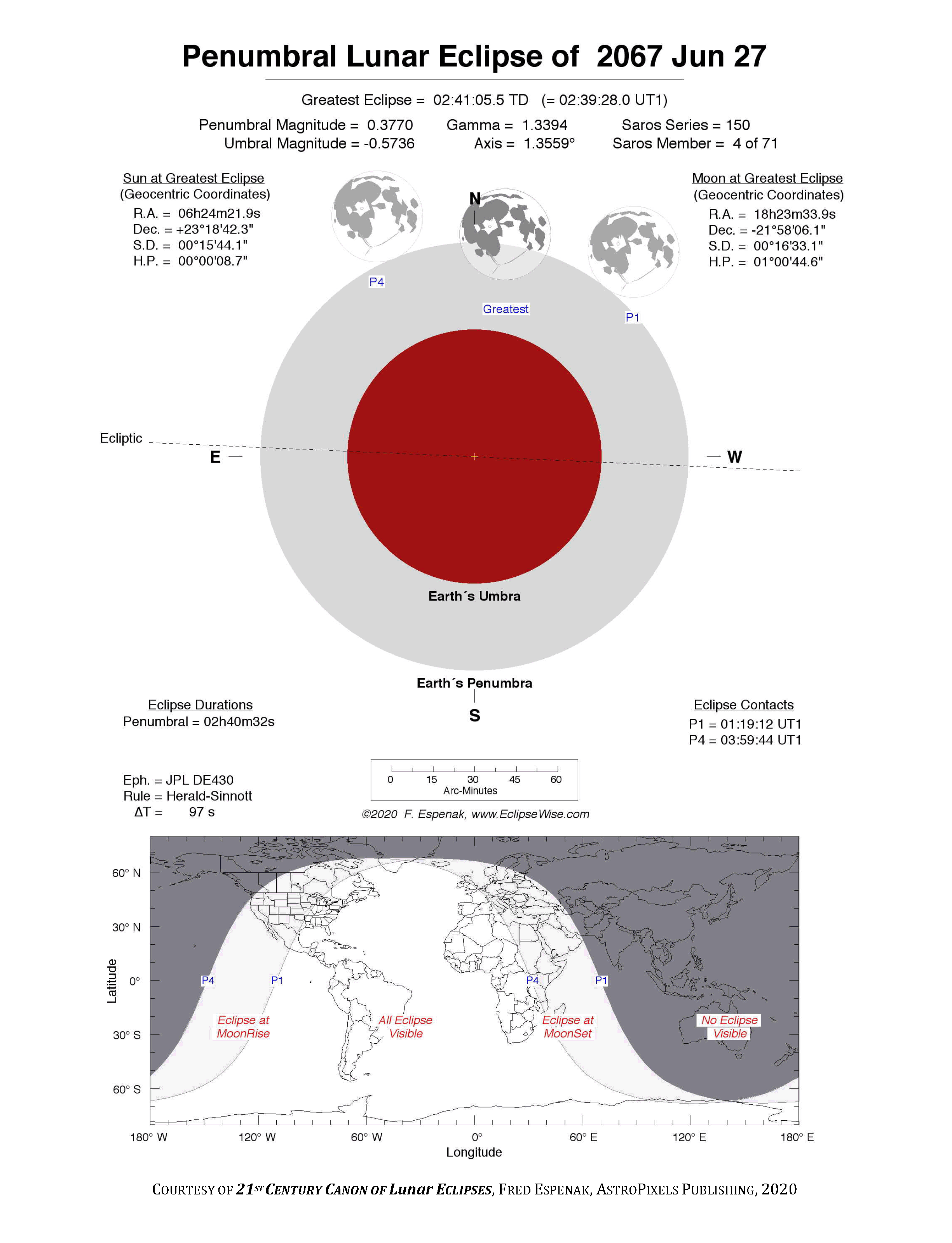 The instant of greatest eclipse takes place on 2067 Jun 27 at 02:41:06 TD (02:39:28 UT1). This is 1.3 days before the Moon reaches perigee. During the eclipse, the Moon is in the constellation Sagittarius. The synodic month in which the eclipse takes place has a Brown Lunation Number of 1787.