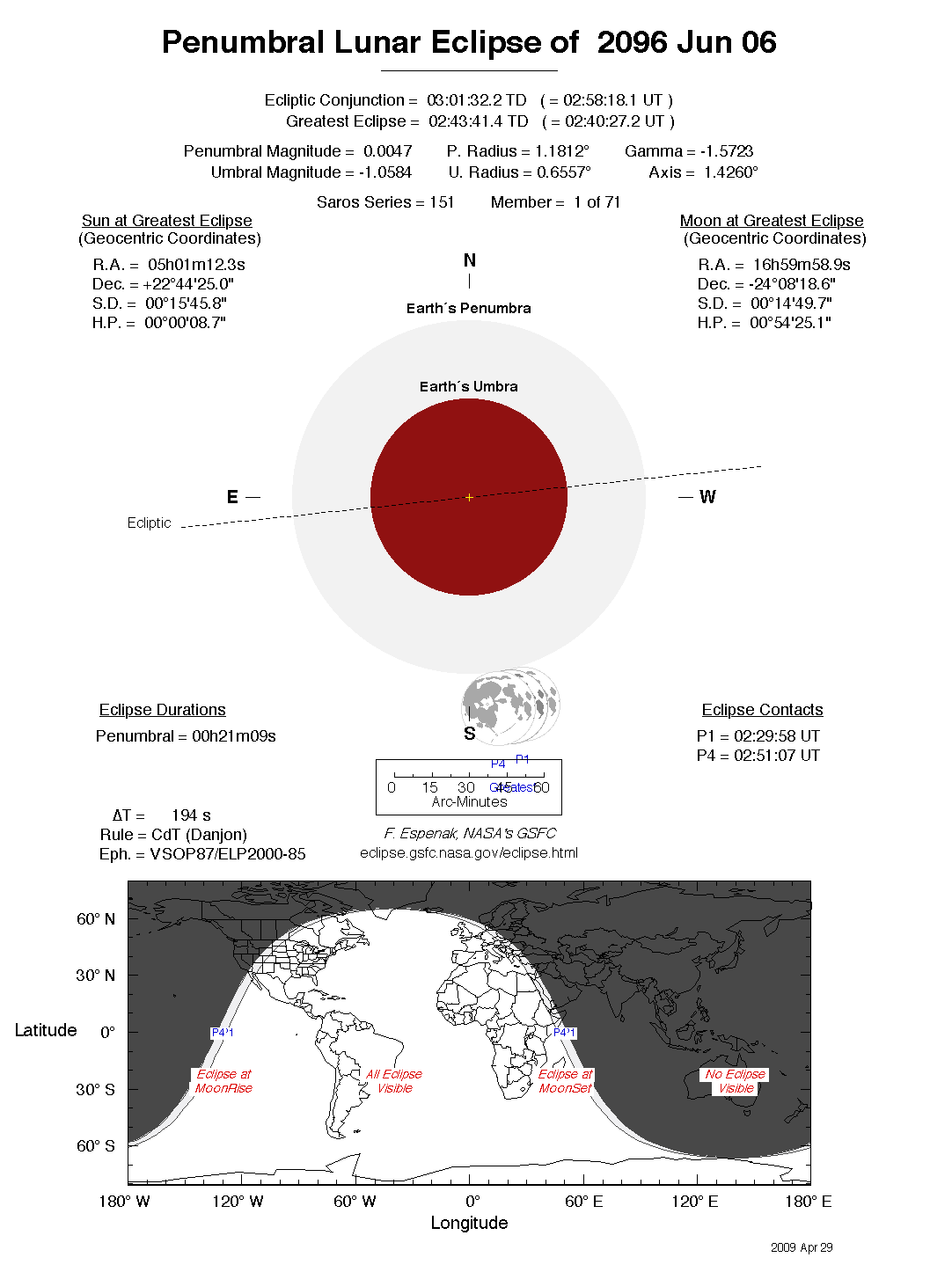 The tables below contain detailed predictions and additional information on the Penumbral Lunar Eclipse of 2096 Jun 06 .