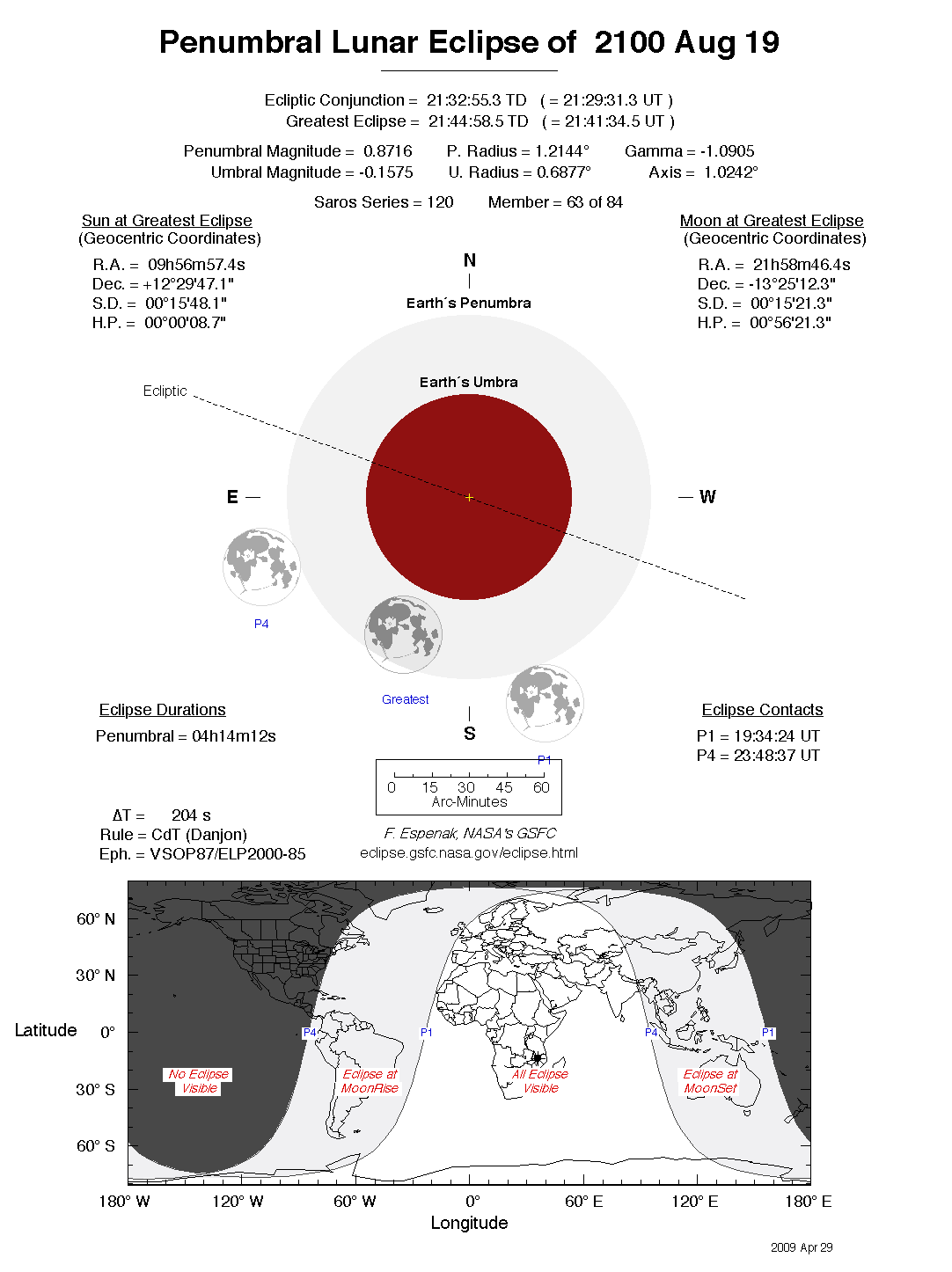 The penumbral lunar eclipse of 2100 Aug 19 is followed two weeks later by a total solar eclipse on 2100 Sep 04.