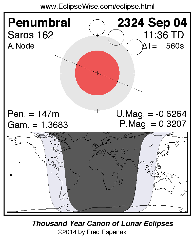Another lunar eclipse occurs one synodic month before the 2324 Sep 04 eclipse. It is the penumbral lunar eclipse of 2324 Aug 06.