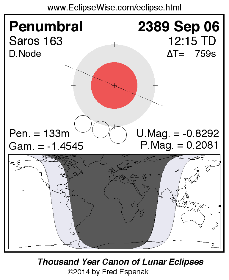 The penumbral lunar eclipse of 2389 Sep 06 is preceded two weeks earlier by a total solar eclipse on 2389 Aug 22.