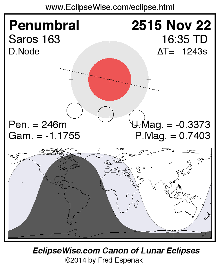 The penumbral lunar eclipse of 2515 Nov 22 is preceded two weeks earlier by a total solar eclipse on 2515 Nov 07.