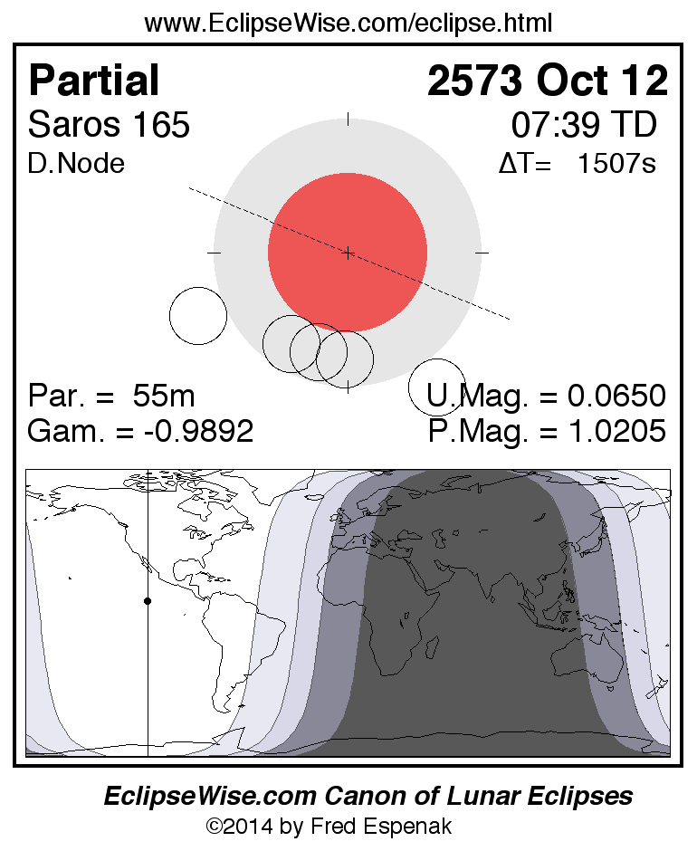 The instant of greatest eclipse takes place on 2573 Oct 12 at 07:39:25 TD (07:14:19 UT1).