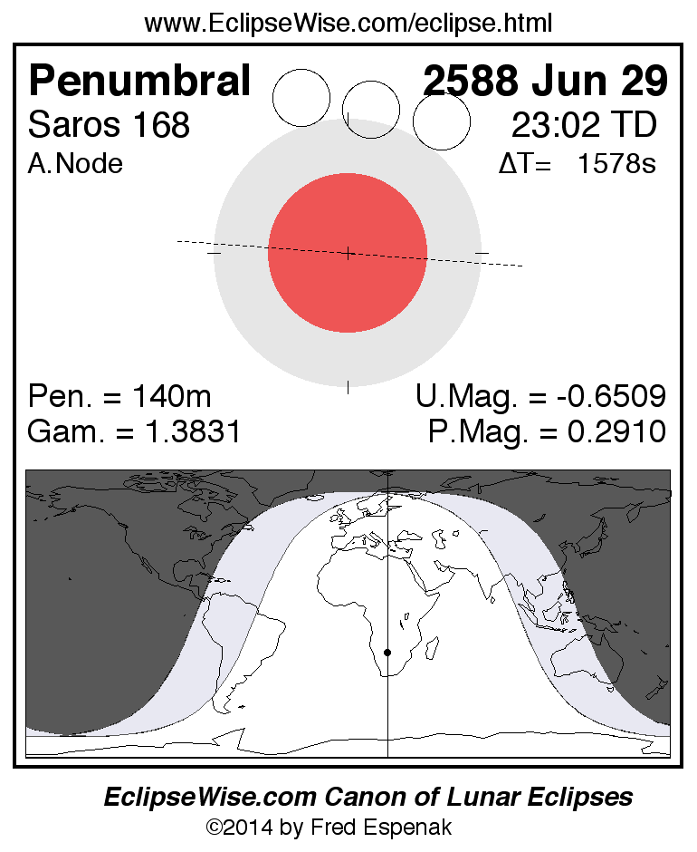 Another lunar eclipse occurs one synodic month before the 2588 Jun 29 eclipse. It is the penumbral lunar eclipse of 2588 May 31.
