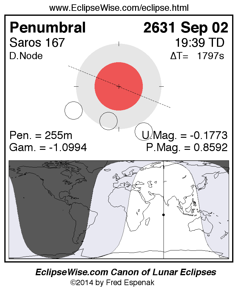 The penumbral lunar eclipse of 2631 Sep 02 is preceded two weeks earlier by a total solar eclipse on 2631 Aug 19.