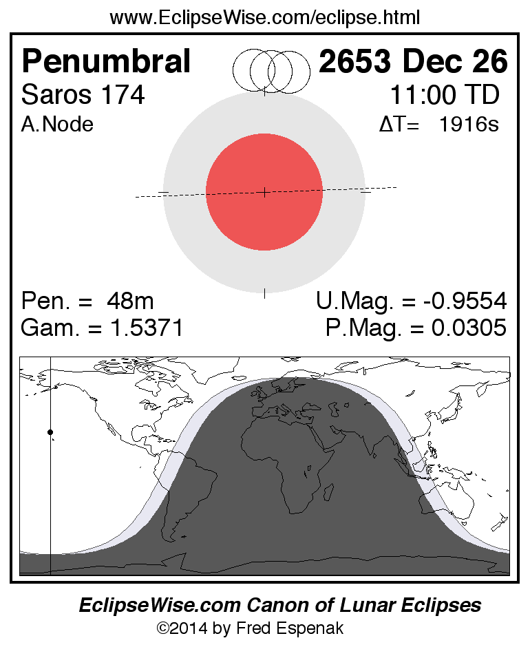 Another lunar eclipse occurs one synodic month before the 2653 Dec 26 eclipse. It is the penumbral lunar eclipse of 2653 Nov 27.