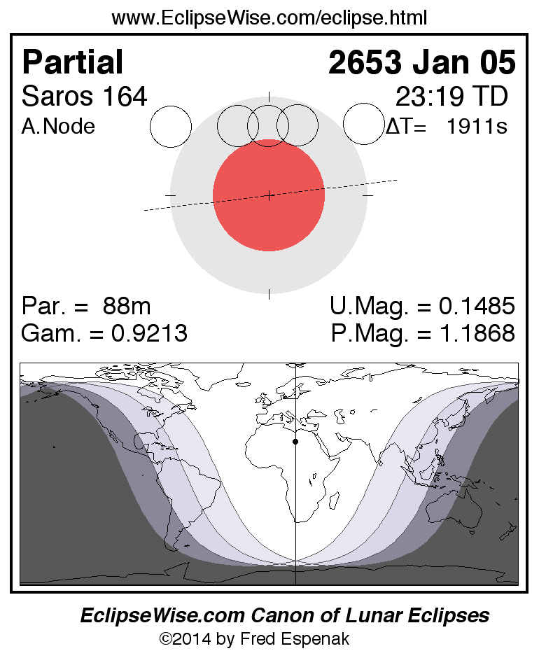 The instant of greatest eclipse takes place on 2653 Jan 05 at 23:18:52 TD (22:47:01 UT1).