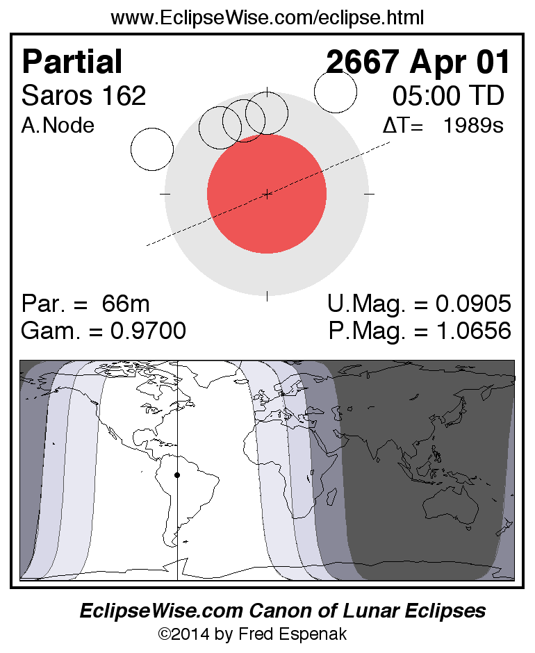The instant of greatest eclipse takes place on 2667 Apr 01 at 04:59:43 TD (04:26:35 UT1).
