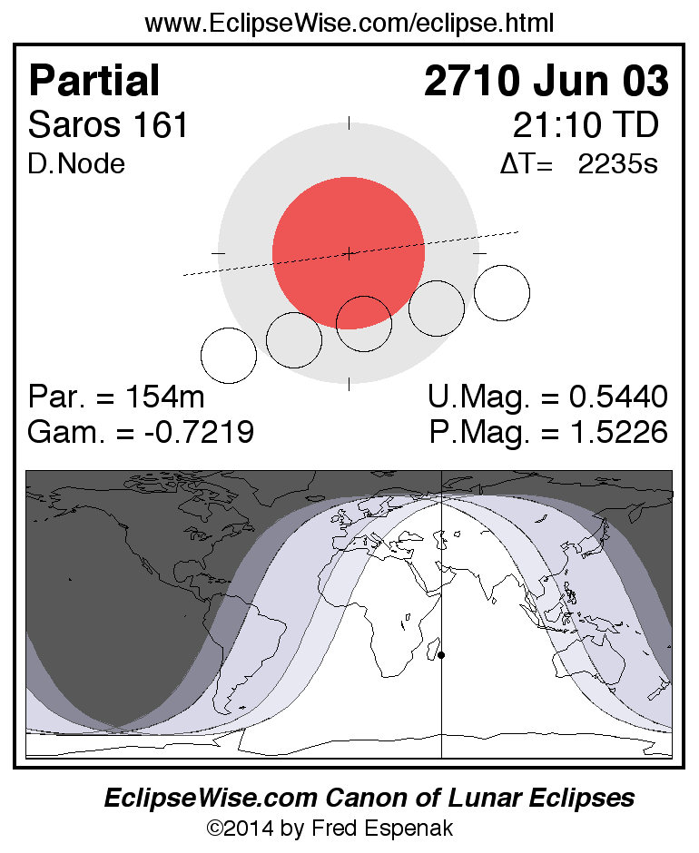 The instant of greatest eclipse takes place on 2710 Jun 03 at 21:10:20 TD (20:33:06 UT1).