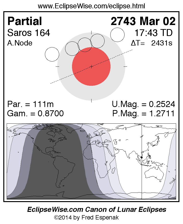 The instant of greatest eclipse takes place on 2743 Mar 02 at 17:43:01 TD (17:02:30 UT1).