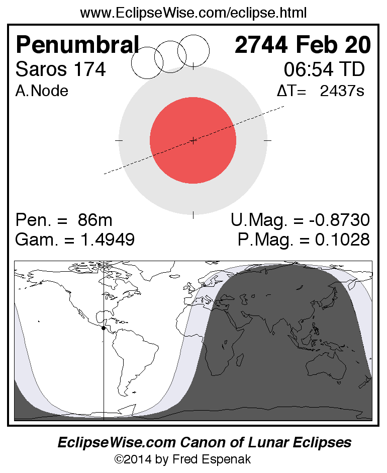 The instant of greatest eclipse takes place on 2744 Feb 20 at 06:54:25 TD (06:13:48 UT1).