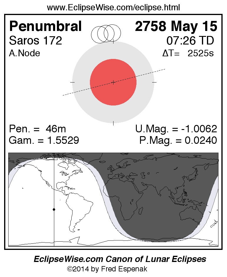 Another lunar eclipse occurs one synodic month before the 2758 May 15 eclipse. It is the penumbral lunar eclipse of 2758 Apr 15.