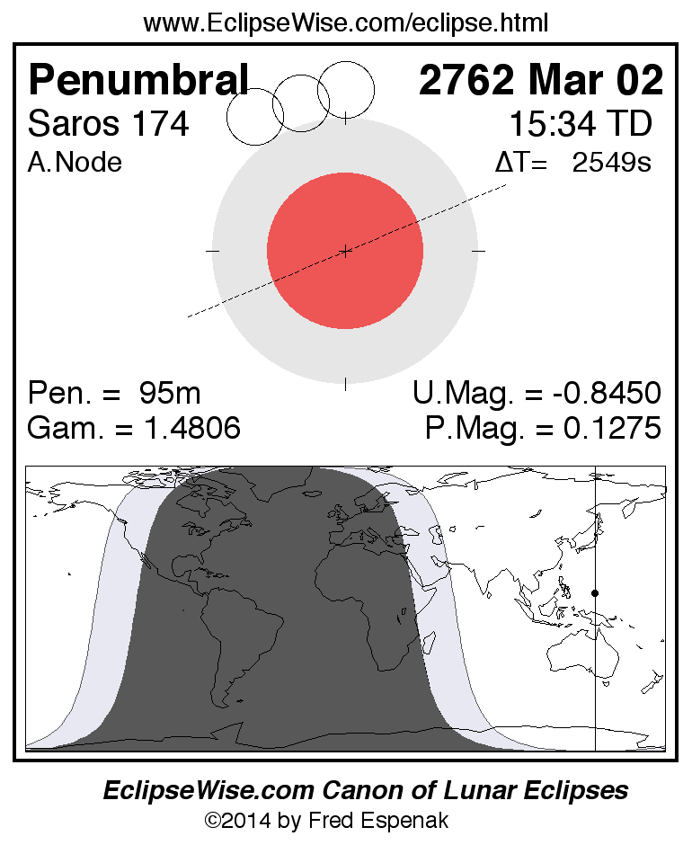 The instant of greatest eclipse takes place on 2762 Mar 02 at 15:33:54 TD (14:51:25 UT1).