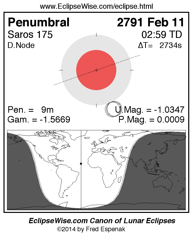 Another lunar eclipse occurs one synodic month before the 2791 Feb 11 eclipse. It is the penumbral lunar eclipse of 2791 Jan 12.