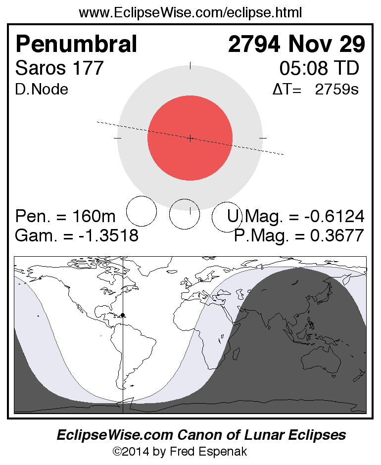 Another lunar eclipse occurs one synodic month before the 2794 Nov 29 eclipse. It is the penumbral lunar eclipse of 2794 Oct 30.