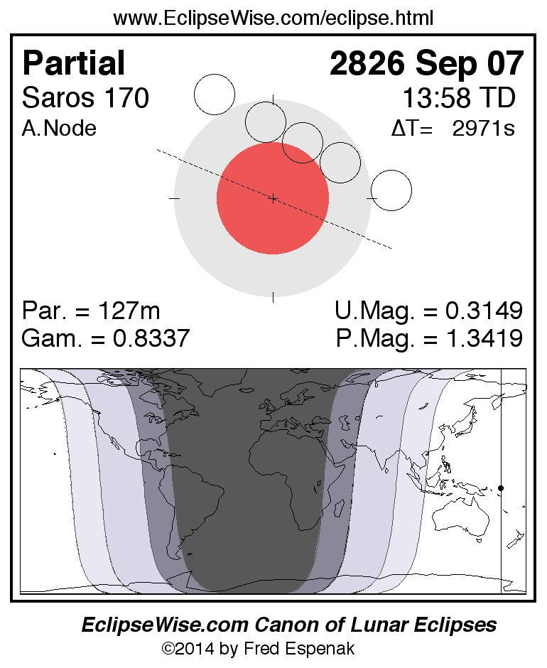 The instant of greatest eclipse takes place on 2826 Sep 07 at 13:57:31 TD (13:08:00 UT1).